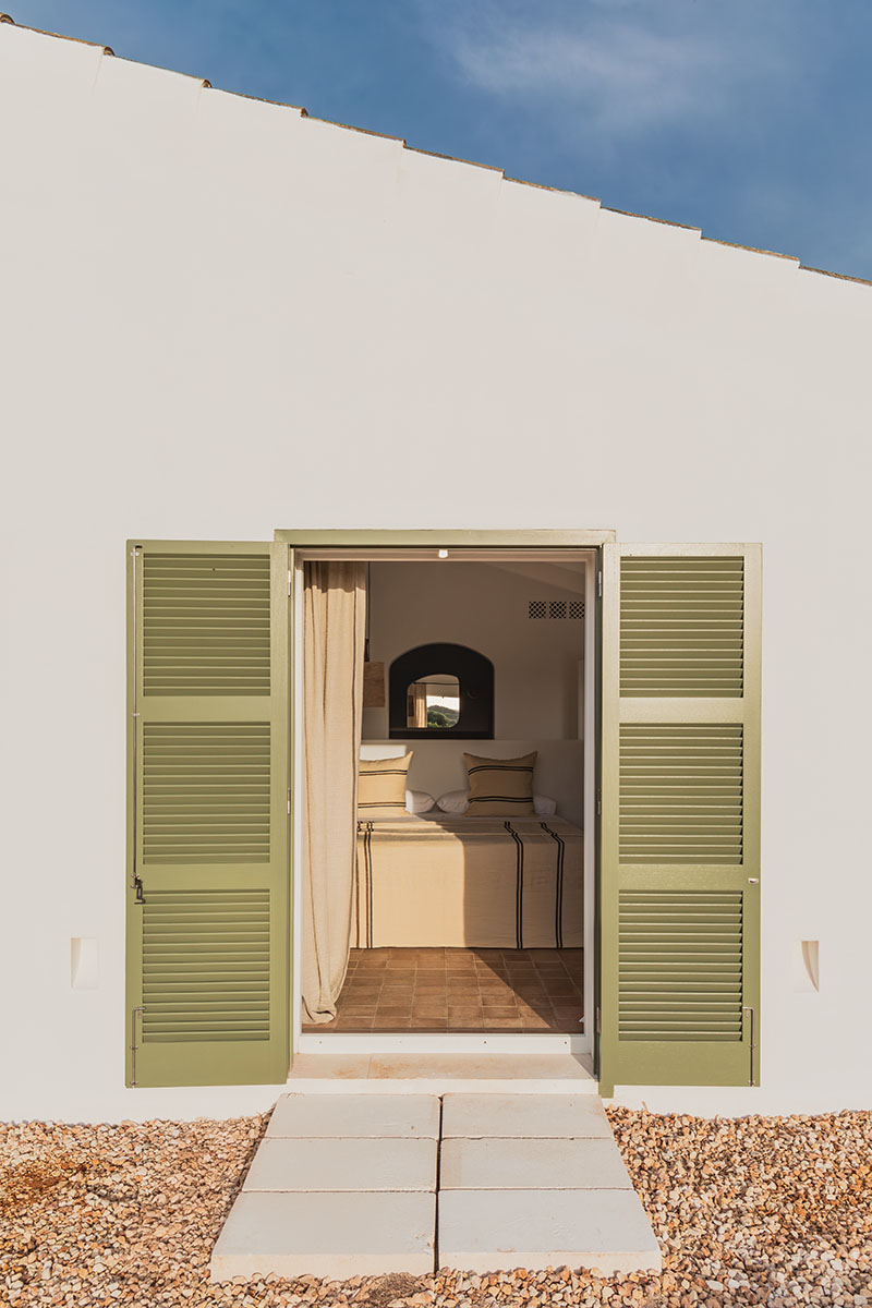 Los materiales empleados —piedra de marés, cal, madera en verde olivo— no solo dialogan con la tradición constructiva menorquina, sino que crean atmósferas que respiran autenticidad. Las contraventanas verdes, típicas de la isla, filtran la luz mediterránea aportando frescura y carácter.