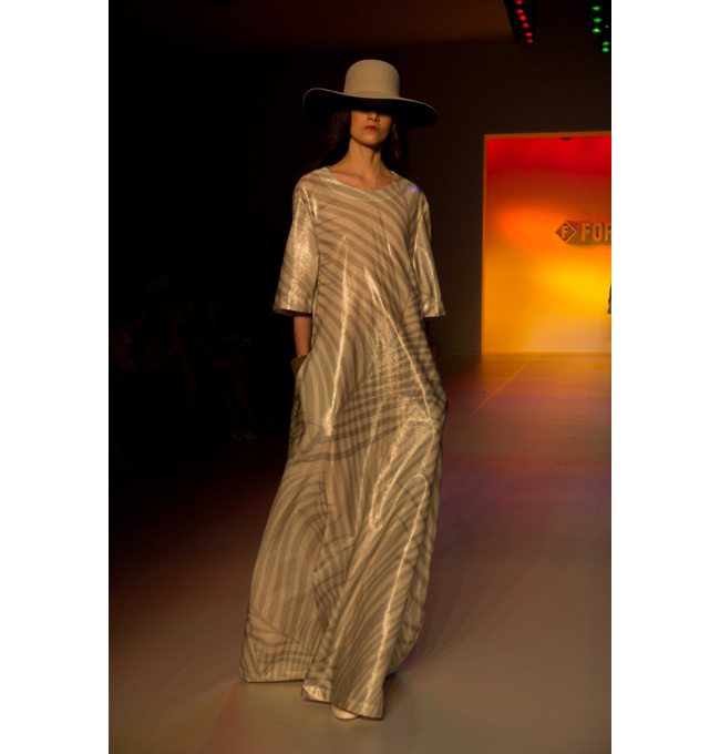 Vitorino Campos is SPFW’s youngest designer with only 24 years and showing on fashion week for the second time. He again showed a very intelligently made collection. He took his inspiration from the desert in Mexico, exhaling a certain silence and isolation, something much needed in today’s fast paced world according to Vitorino. The collection started with nude coloured pieces, round volumes in the sleeves, progressing with a more slick, full metallic look. Which surprisingly did not appear futuristic at all, as it gave a soft and feminine but powerful look. Again we saw his experiment with stripes, this time in colourful, oversized tops on pleaded mini skirts.