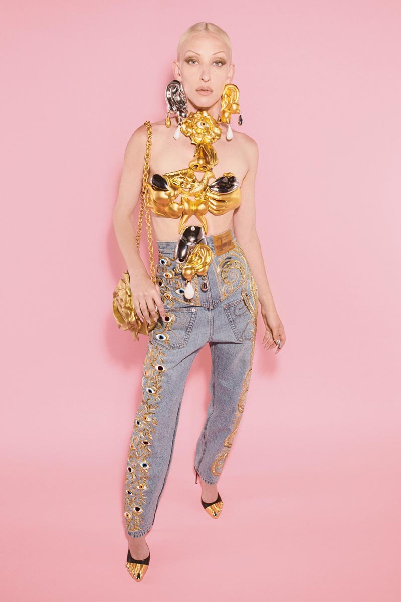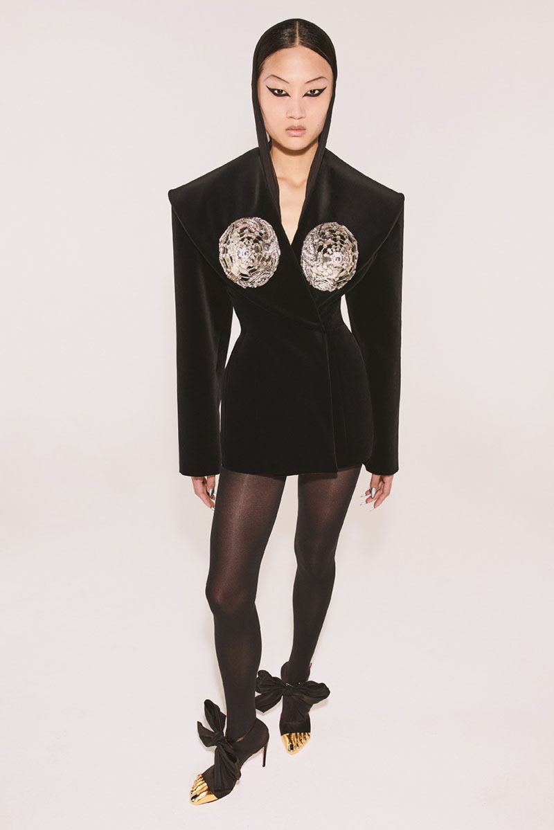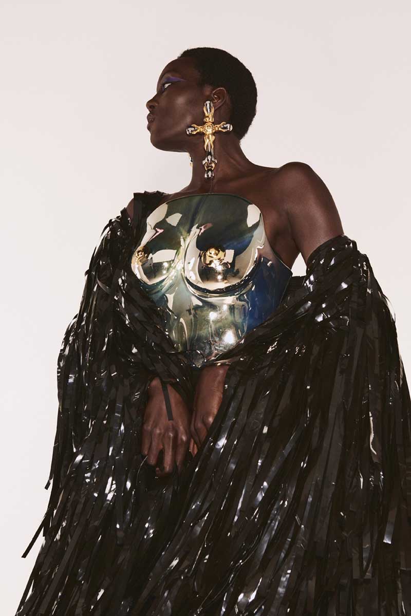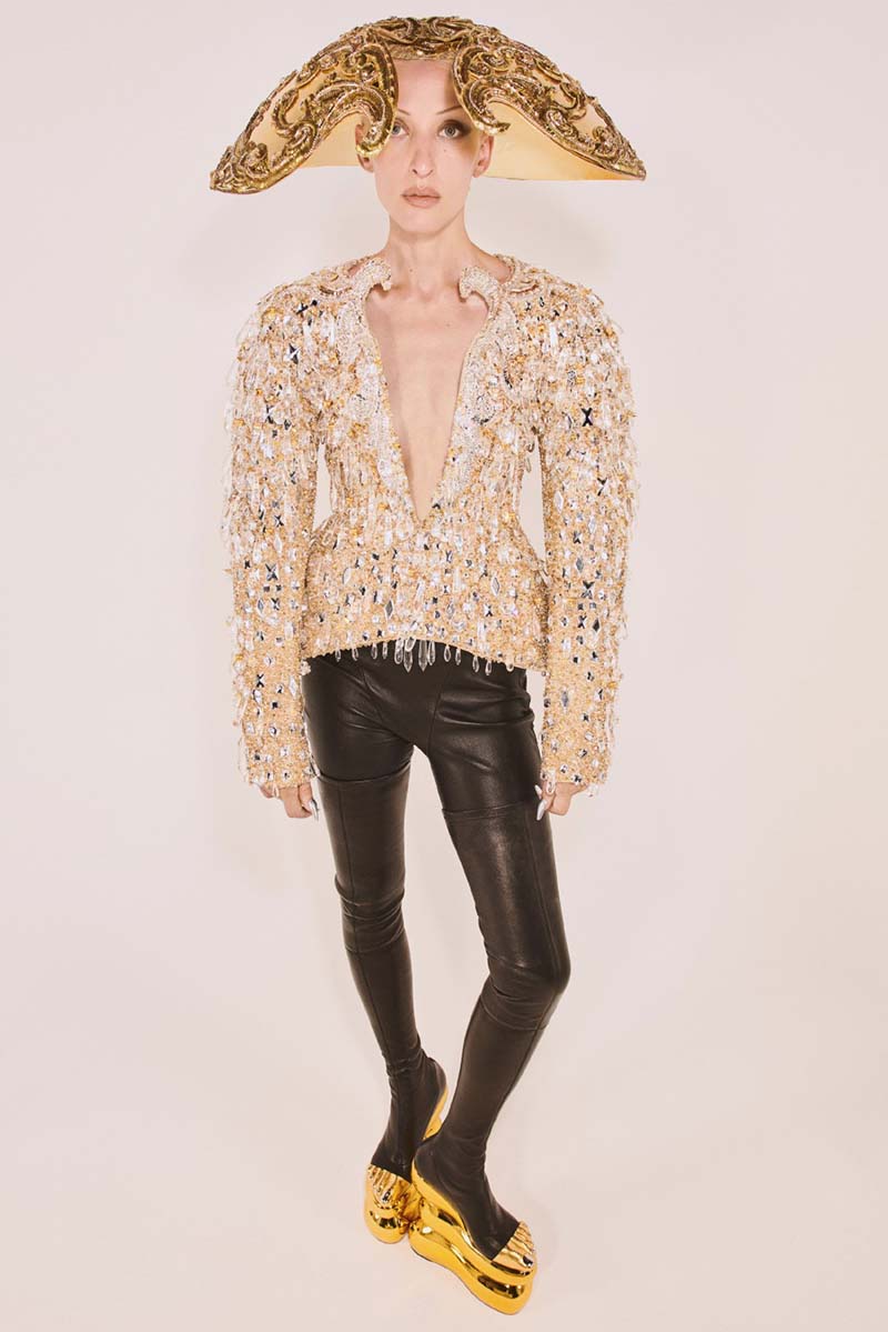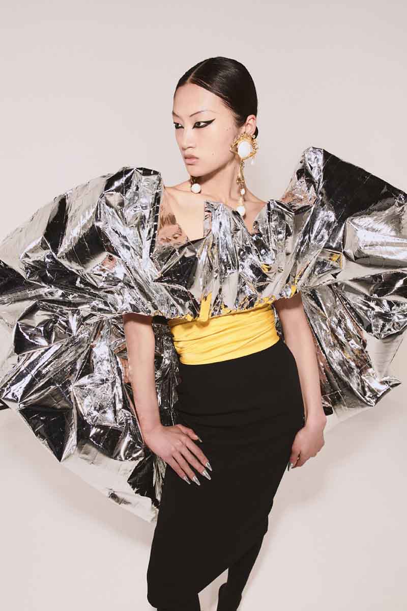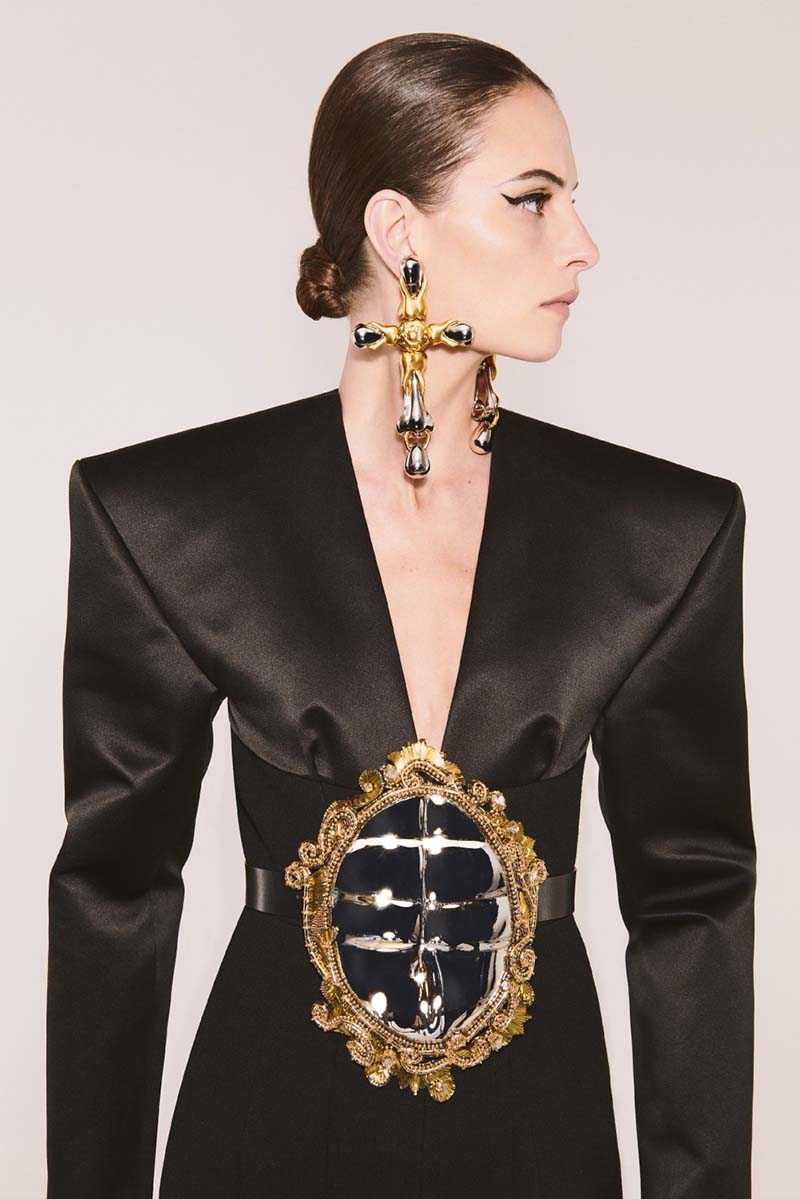 Schiaparelli FW 21-22 está formada por 3 partes. La primera de ellas es un tributo a las icónicas chaquetas recortadas de mezclilla blanca de la firma. Excéntricos bordados y mangas voluptuosas con colores atrevidos rematados con detalles en negro. La segunda parte de la colección se inspira en un elemento fundamental de Schiaparelli, el bijoux. Se traduce del francés como joyas y recupera los clásicos y recargados detalles metálicos aplicados sobre tela.