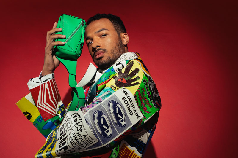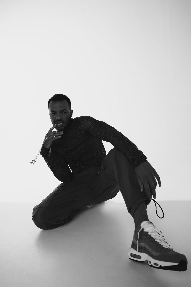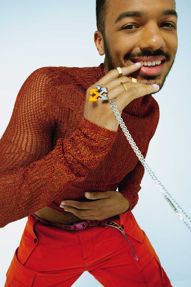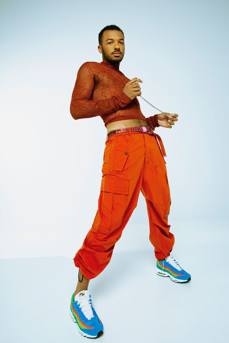 Sergio Momo con top y pantalón Dsquared2, más cinturón, collar y anillos de Off-White, y zapatillas Nike Air Max 95