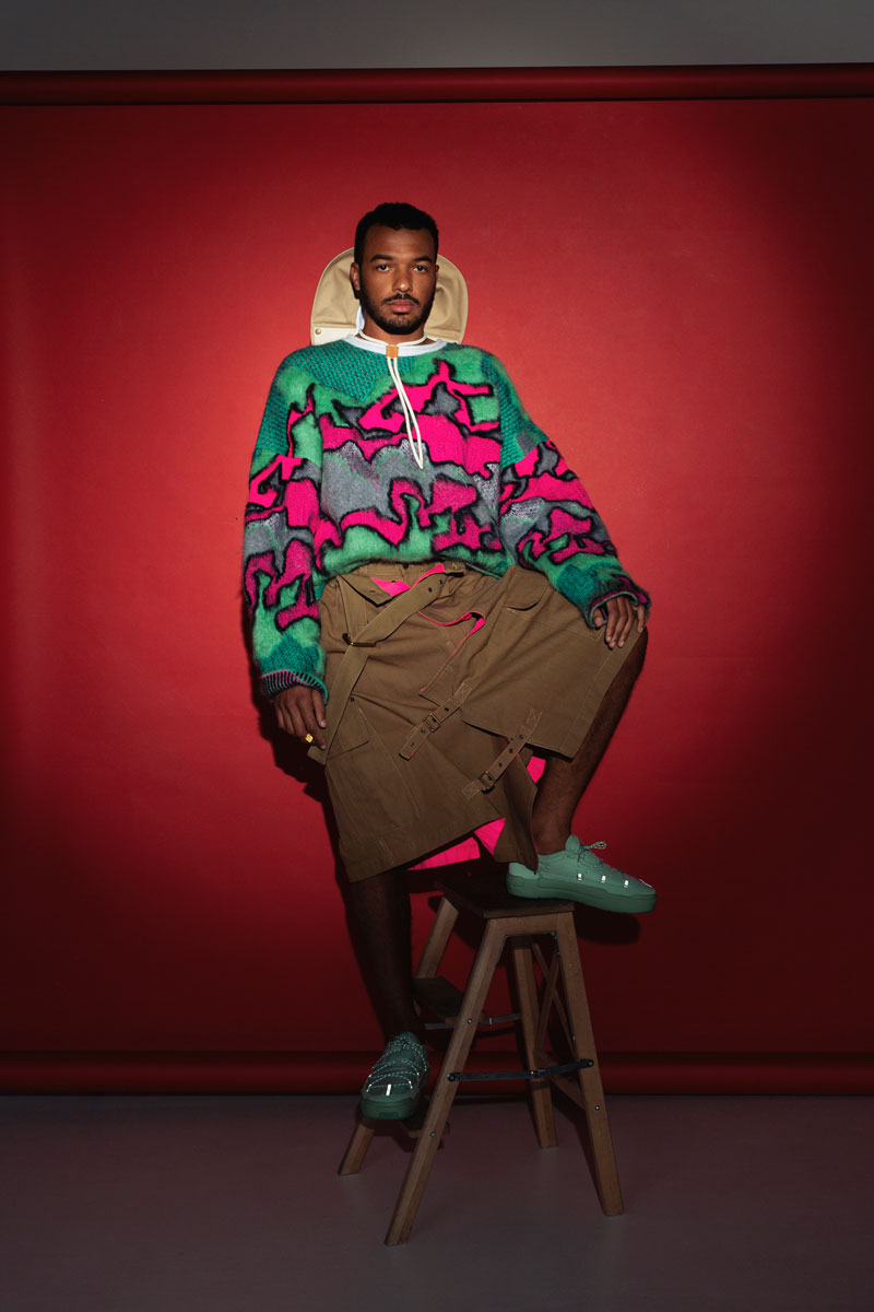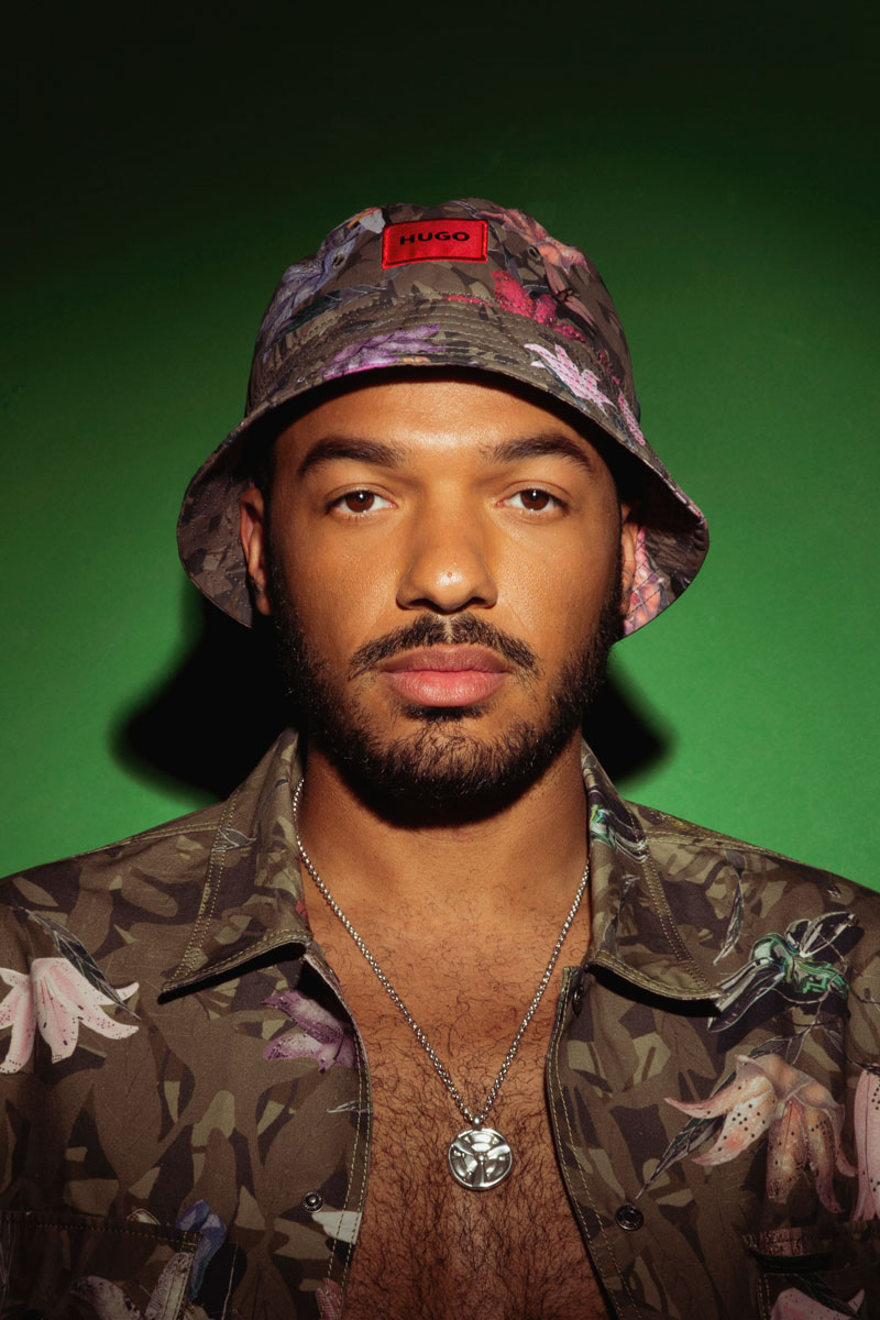 Sergio Momo con pantalón y jersey de Loewe, zapatillas de Nike, gorro de Levi’s y anillos de Swarovski