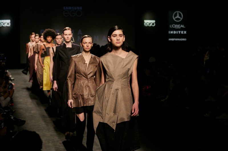 Arriba: Imagen del desfile de Fátima Miñana @fatima.minana en Ego dentro de Mercedes-Benz Fashion Week Madrid
