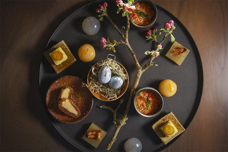 Recordemos: esto es un restaurante, no el parque de atracciones de una secta feliz. Así que vayamos con el menú de 11 platos, en constante rotación, adaptable a todo tipo de intolerancias y alergias, y elaborado a partir de los productos que recolectan en sus cinco acres de zona de viñedos de San Lorenzo, en Healdsburg. El formato es el del kaiseki japonés, una degustación ligera de mini porciones que suele acompañar la ceremonia del té y por la que la cocina japonesa divide las estaciones de temporada hasta en 72 fracciones distintas. Sirven pescados, fermentados, verduras, caldos, mariscos, si bien todo sabe mejor si se combina con un poquito de foie o de caviar, por ejemplo. Y el conjunto ornamental se completa con las flores que el equipo de Katina recoge a diario.