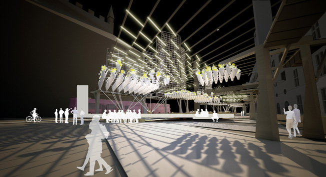 “Lighting Device” propone la transformación del viento en energía eléctrica para convertir una plaza en un espacio urbano para usos muy diversos: desde la celebración de un concierto a su transformación en sala de conferencias. Ello sería posible a través de un artilugio que cuelga de una red de cables de acero sobre la plaza y que actúa también como elemento estético, ya que puede variar la intensidad de la luz y sus propios colores. Pero lo mejor de todo es que este artilugio podría generar 2.688 kilowatios por hora. Por el uso exclusivo de energías renovables y por su proyección social en un contexto urbano, ha sido elegido ganador del smart future minds awards. El segundo premio se lo llevó el CoLeCtIvO cOnCePtUaRtE de Badajoz, con un proyecto de reciclaje de una cementera en espacio autogestionado. Y el tercero recayó en estonoesunsolar, desarrollado por Patricia diMonte e Ignacio Grávalos, consistente en localizar solares dentro de las ciudades y adaptarlos para el disfrute de sus ciudadanos.