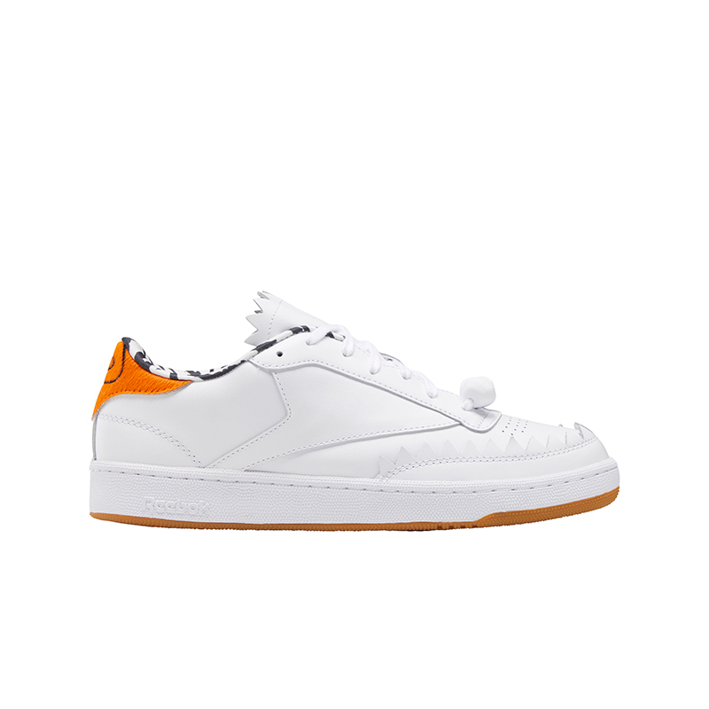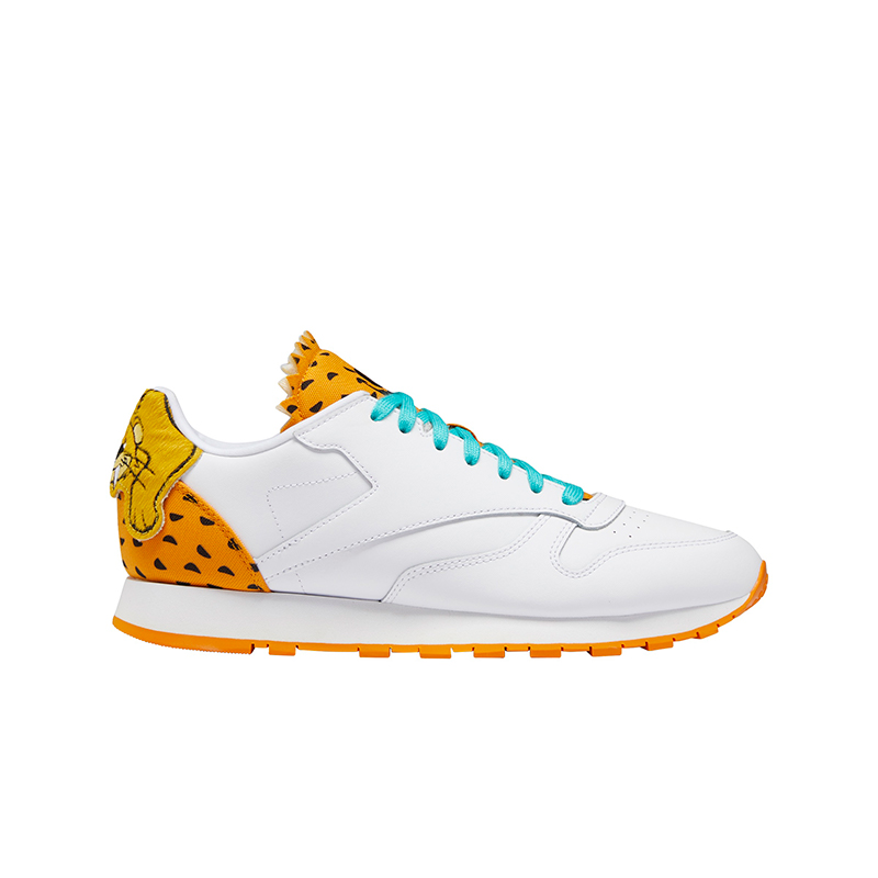 La silueta que despertó a Reebok de su olvido en los últimos años y que encabezó el movimiento de zapatillas retro se viste ahora con los colores de Wilma Flinstone, la esposa de Fred en una construcción totalmente blanca con detalles a contraste en naranja. Su icónico collar de piedras puede verse en el colgante de los cordones. El interior de la zapatilla rinde homenaje a sus otros looks.