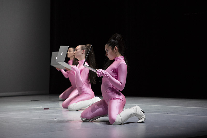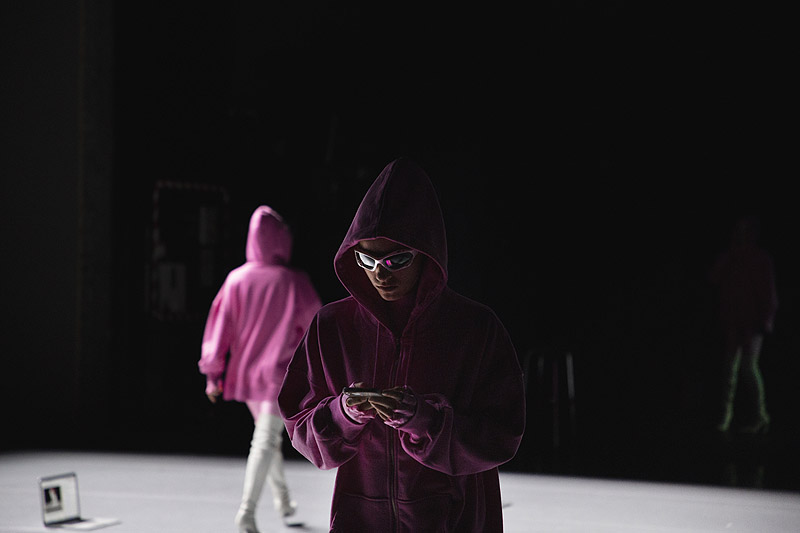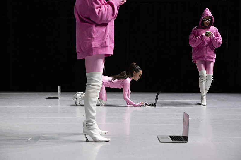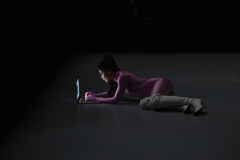La escenificación se teje con elementos provocadores: computadoras Apple y móviles. Monos de licra rosa y botas altas. Gafas de sol y la tenue luminosidad de las pantallas. Este collage visual cincela la imaginación del espectador. Y no solo eso, sino que enriquece la experiencia tanto desde las butacas como a través de la pantalla del smartphone.