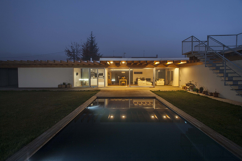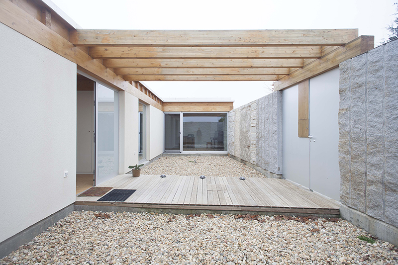 Cuando les encargaron el proyecto, en una parcela de Zamora, el único requisito de la propietaria era que fuera una casa sostenible. Las primera decisión del estudio CSO Arquitectura fue la construcción de un muro que rodea toda la vivienda, para protegerla de la temperatura, con la que además consiguen crear un espacio totalmente introspectivo. El muro está realizado en costero de granito y tiene unos 117 metros de perímetro. Al proyecto le han bautizado como Casa Fortaleza.