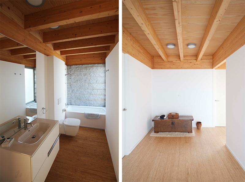 Además de la orientación, los arquitectos han utilizado otros recursos para convertirla en sostenible. En el interior del muro, la vivienda, de una sola planta y tres dormitorios, está inspirada en una casa de patio tradicional con tres patios que separan las tres zonas de la vivienda: entrada, zona de estar y zona de noche y una planta en forma de T, un sistema de patios que permite la ventilación cruzada en la vivienda además de crear un ambiente zen. Dentro de la vivienda se repiten los materiales del exterior, también ecológicos: piedra en algunas de las fachadas, suelos de tarima ecológica de bambú y vigas de madera laminada de pino. Sobre la planta, una cubierta ajardinada con plantas de bajo consumo protege también la casa de la temperatura exterior y le dan una función energética. La casa además está sobreaislada, otra forma de mantener la temperatura, aprovechar la energía geotérmica y convertir esta fortaleza en un espacio que aprovecha al máximo los recursos naturales.