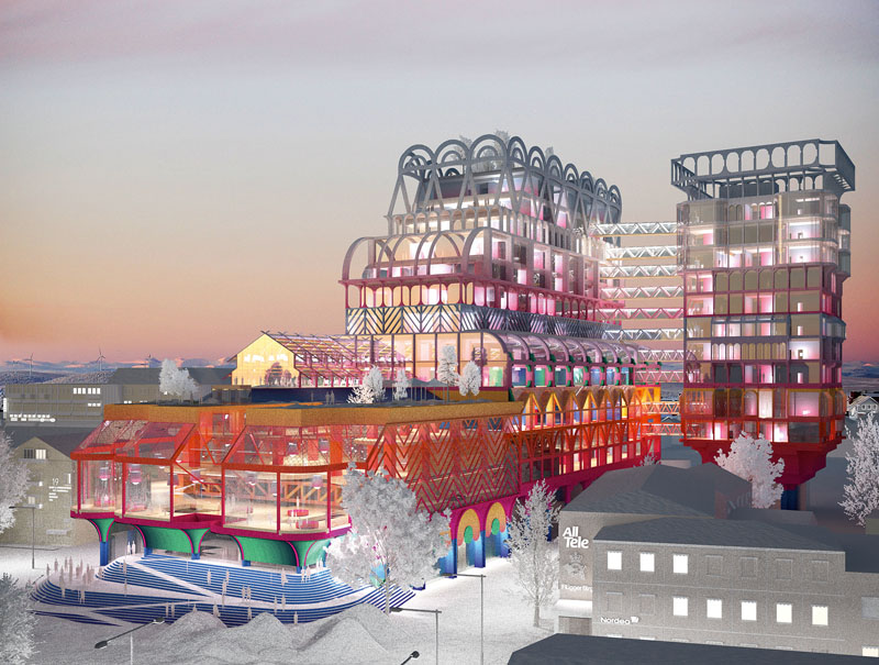 Imagen superior ‘Träbågen’ (2016) propuesta para un centro cultural en Skellefteå. © Space Popular