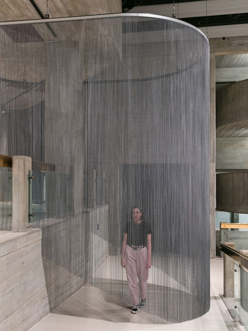 En la exposición Space Shifters también encontramos obras hecha adhoc como la de Daniel Steegmann Mangrané, (2018). Se trata de unas cortinas de eslabones que crean una barrera temporal entre dos galerías en el piso inferior y están inspiradas en la forma de las escaleras de hormigón fundido de la arquitectura brutalista de Hayward Gallery