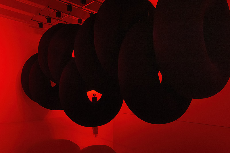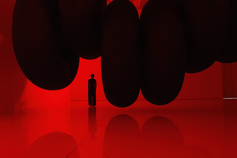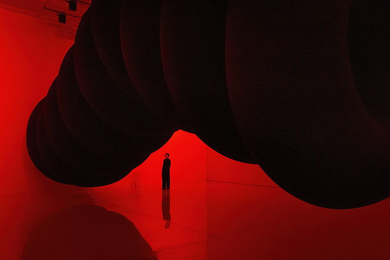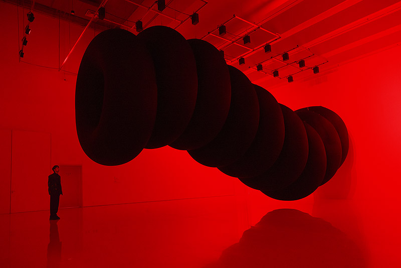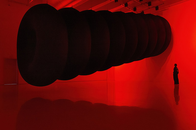 Los lentos movimientos de la escultura evocan la imagen de un inmenso animal que se desplaza pesadamente, en una experiencia visual y espacial dominada por el intenso contraste entre las formas negras y la dura luz roja.