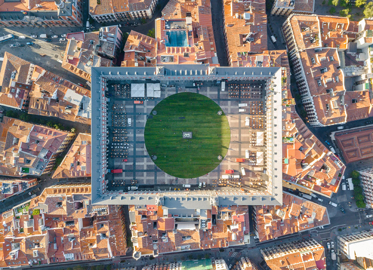 La idea del proyecto es simple, consiste en la reproducción de un perfecto circulo de 70mt de diámetro formado por césped natural instalado en el centro de la plaza Mayor de Madrid.
