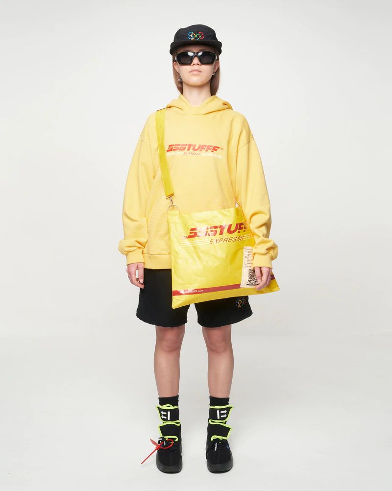 Hace dos semanas, SSSTUFFF presentó la marca dentro del espacio comercial en Madrid, junto a las nuevas pizzas que están conquistando Madrid: Napoli Gang. El público puede descubrir de primera mano cómo son sus diseños estrambóticos. Entre globos de Hello Kitty y tarta de colores, están las icónicas camisetas con logos noventeros. No podemos dejar pasar los accesorios. Los calcetines, riñoneras acolchadas o las viseras han sido los auténticos ganchos.