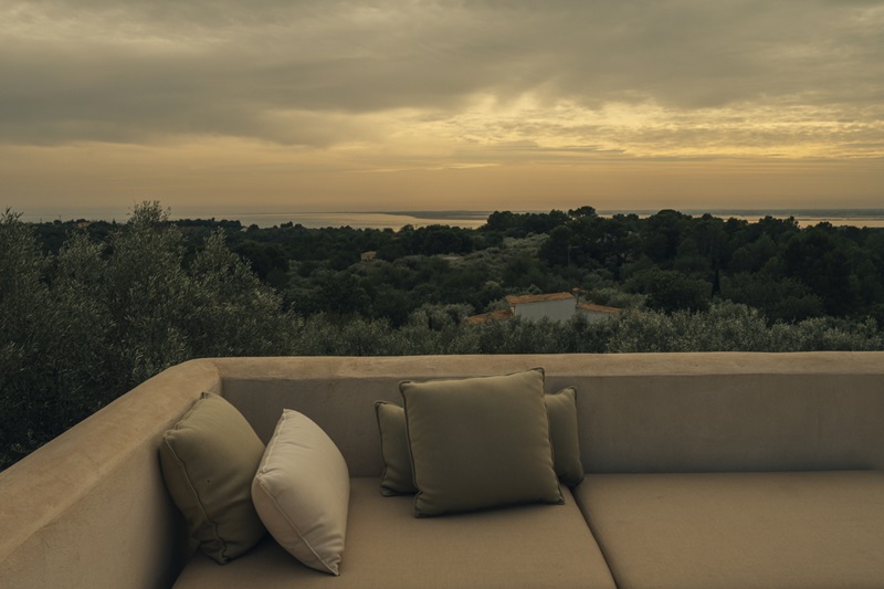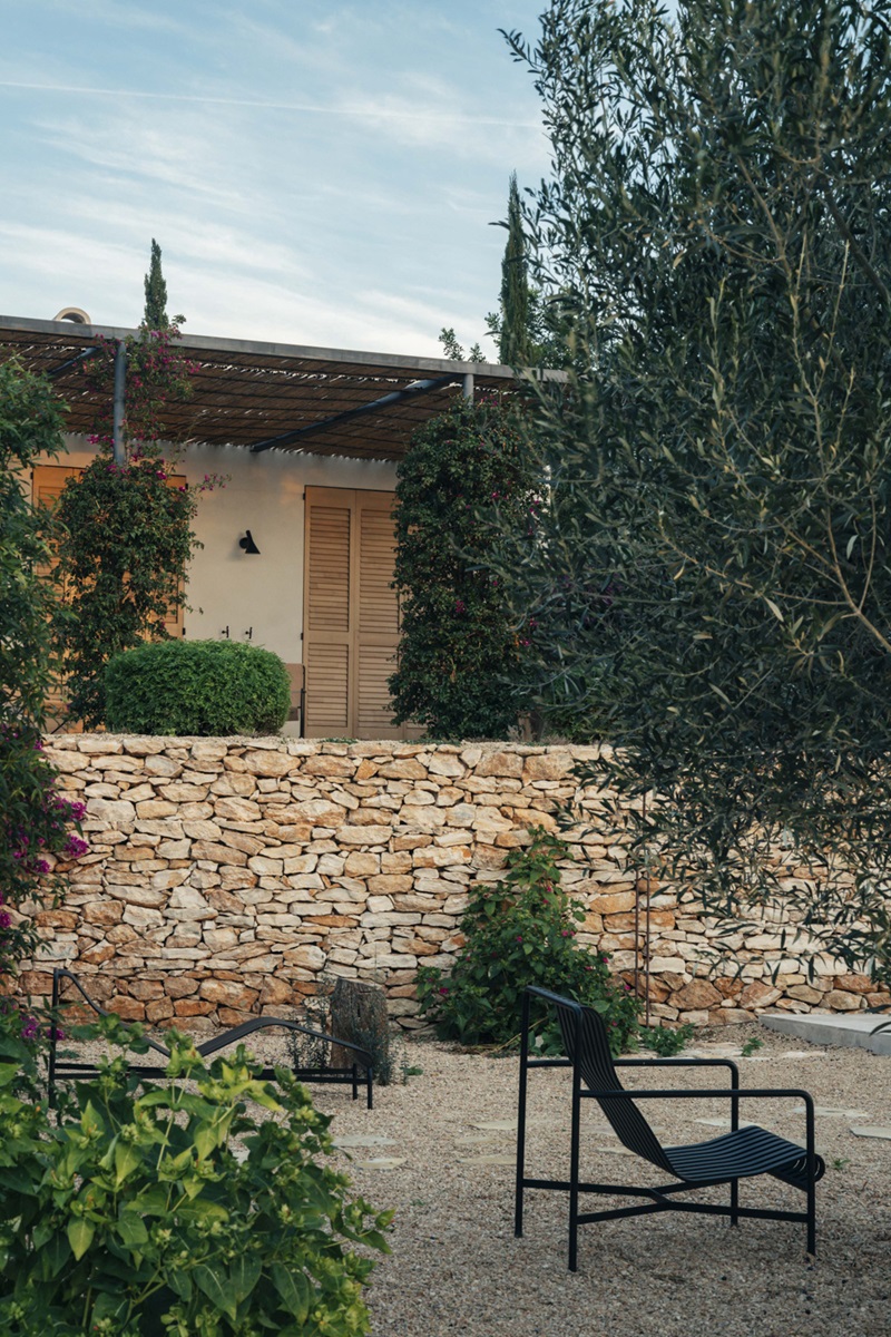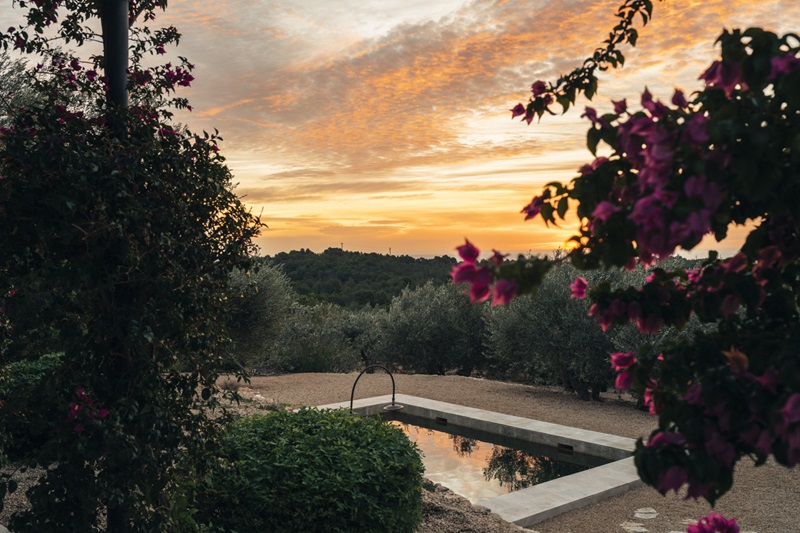 La parcela rural de 4.000 m2 está concebida como un jardín silvestre, donde se han sembrado macizos de plantas aromáticas, como salvia, romero, alcaparras y santolinas. También hay una zona reservada para el solárium con un banco corrido desde donde se contempla la salida y puesta del sol y el Mediterráneo a lo lejos. Además, la parcela cuenta con una piscina natural revestida con mármol de color crema.