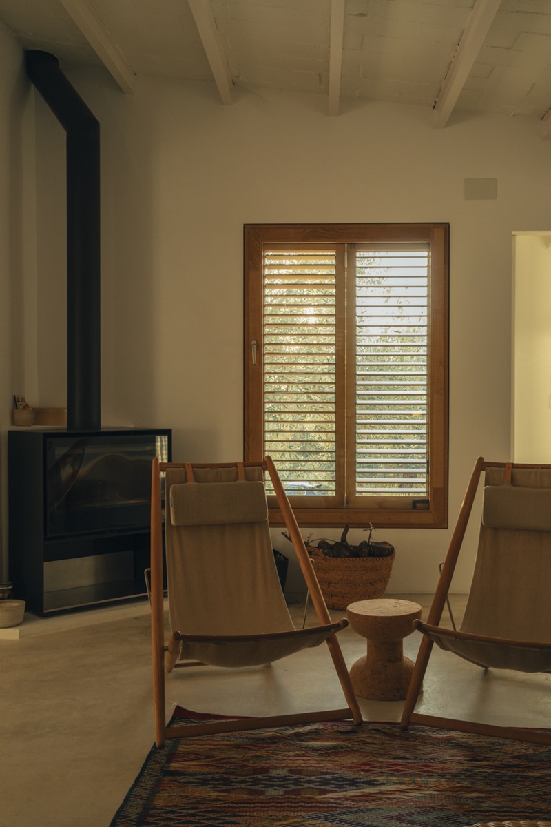 La reforma destaca en fachada por las refinadas carpinterías de castaño macizo que conforman los marcos de los ventanales y los porticones exteriores. En los interiores, el equipo apuesta por los tonos crudos, presentes en los pavimentos de hormigón y las paredes de estuco a la cal.
