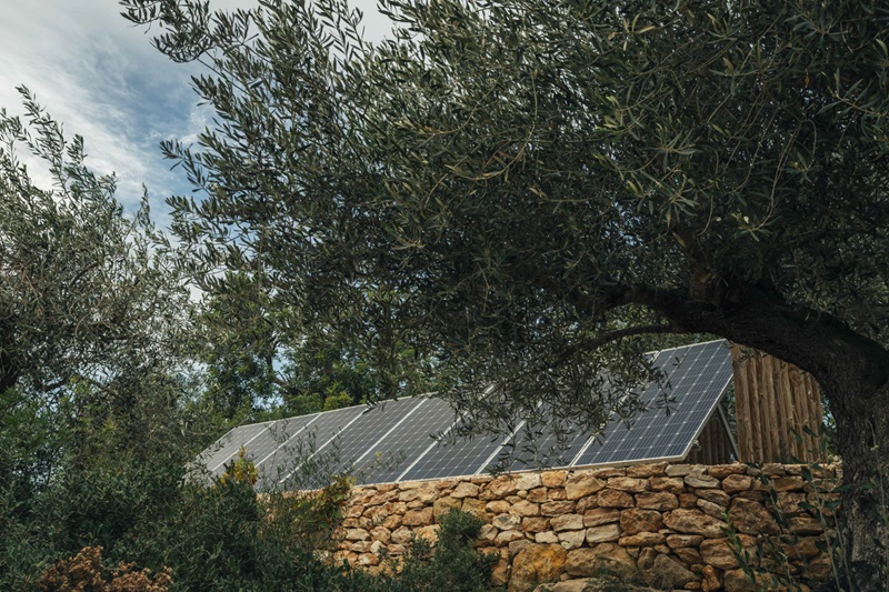 Los volúmenes están asentados en el terreno sobre distintos niveles, delimitados por muros de piedra caliza local y salvados por escaleras construidas con el mismo material, que relucen en suaves tonos terracota. El estudio ha recurrido a proveedores de la zona para reparar y garantizar la continuidad de estas bellas construcciones de mampostería en seco preexistentes en el lugar que, al mismo tiempo, contribuyen a reforzar la identidad rústica de la vivienda.