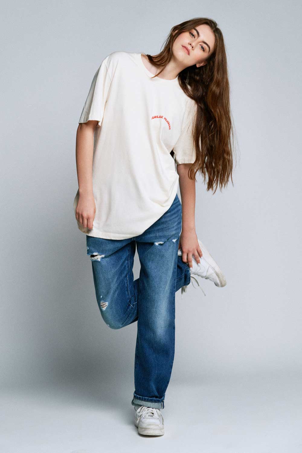 Stephanie Gil con camiseta LOREAK MENDIAN y jeans LEVI’S