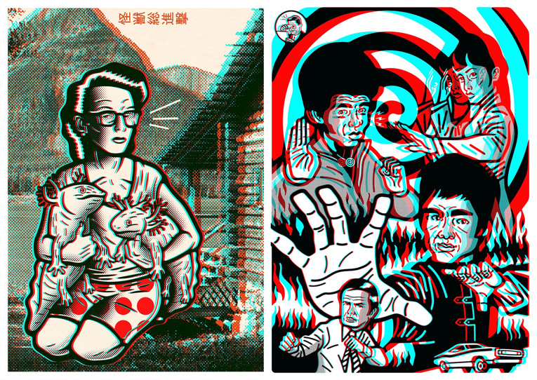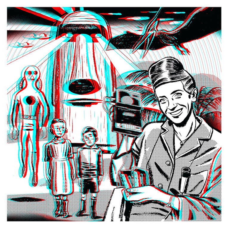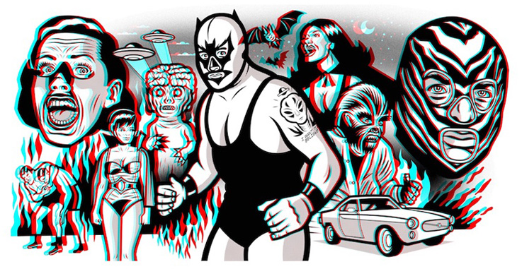 La galería de arte madrileña La Fiambrera (Calle del Pez, 7) presenta Stereo-Vision, exposición del artista argentino (Jorge) Doctor Alderete. Se trata de su primera exposición en solitario en una galería española y ya está abierta al público. Reúne una colección de imágenes cuyo hilo conductor, además de algunas obsesiones siempre presentes en el trabajo del artista (la lucha libre, los ovnis, las culturas polinésicas, las pin-ups, los monstruos, el rock&roll, las películas de serie B… ) es su representación gráfica.