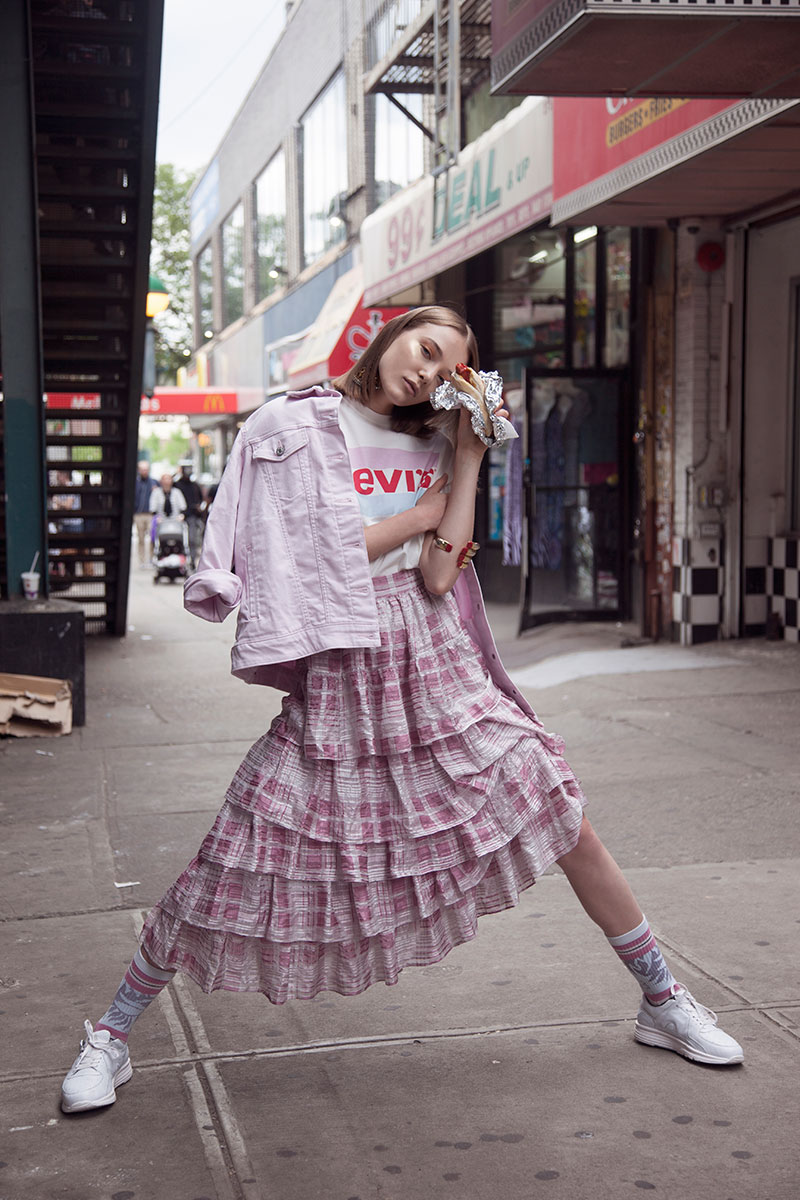 Arriba: Camiseta y cazadora Levi’s + Falda LovesHackFancy + Calcetines Stance + Zapatillas Camper + Pulseras Erickson Beamon