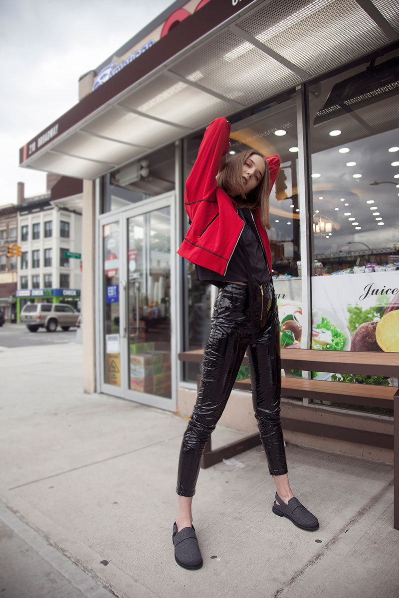 Arriba: Chaqueta roja Smarteez + Camiseta Levi’s + Pantalón cuero Miss Circle + Zapatos Camper