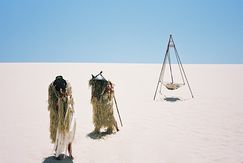 Desierto, aparatajes y hierro, metal doblado con primor, estructuras como cápsulas espaciales pulidas, estelares en un sentido glamuroso, tipis lunares y un tono tribal y chamánico en sus performances. La serie de esculturas y fotos de Boone con Fagan llevan al espectador a ese estado intermedio del ser entre dos universos. En su obra hay un cierto recuerdo de Jodorowsky y los paisajes distópicos de las novelas gráficas ciberpunk. Desiertos con objetos estéticos y disparatados, restos de culturas extintas o indicios de tecnologías avanzadas. El mundo más allá de las colinas desiertas de Boone es un misterio hasta que no las caminas como El Topo camina, con la santa madre meta de encontrar algún estado de comprensión e iluminación. La serie construye la idea de reino marciano habitado por criaturas que miran a los viajeros, les conducen y les introducen en sus ritos. Study of Dimensional Travels en palabras de Boone “fue capturado en un paisaje desértico para que el viajero y espectador tenga una sensación de purgatorio; donde su destino es desconocido”.