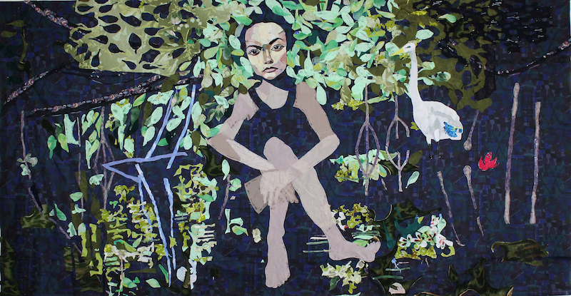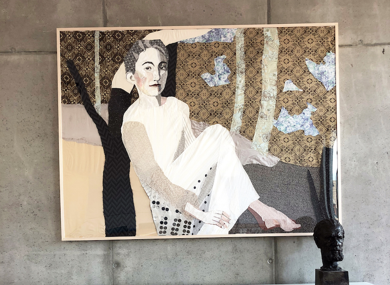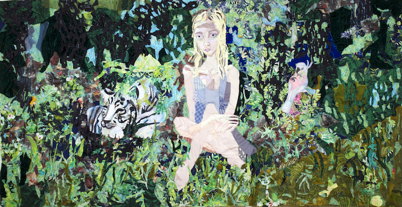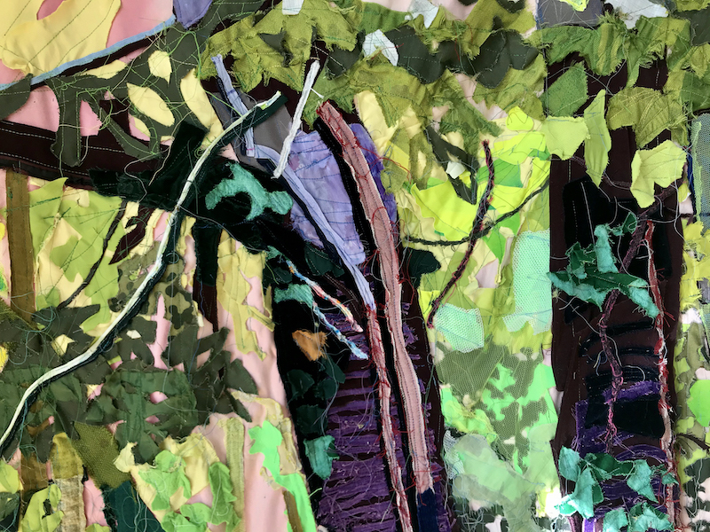 La artista Diane Lavoie usa tejidos para crear collages de gran formato sobre temas identitarios, naturaleza y lugares. Utiliza pegamento, hilo, tijeras y telas para crear composiciones de ambición pictórica, en las que reemplaza la pintura por textiles exuberantes de diferente composición, estampado y opacidad ensamblando así figuras, texturas y tonos.