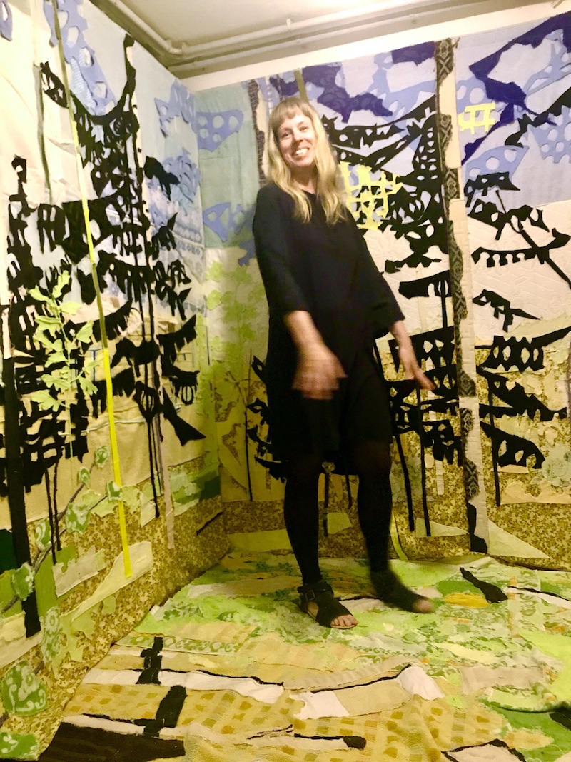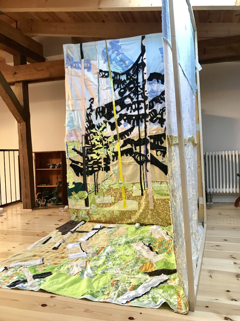 Diane Lavoie: Cuando niña cosía a mano o a máquina retazos de telas, a veces eran mantas para mis muñecas, a veces sólo era coser por coser. Durante mi carrera he trabajado con todo tipo de medios, desde la fotografía hasta la cerámica. En 2007, entré en un programa de postgrado de tres años de pintura al óleo y al final acabé haciendo proyecciones de video sobre grandes collages de tela. En un momento dado recibí feedback de un exitoso video artista visitante quién me dijo que porqué no trabajaba sólo con tela. Después de la escuela de arte, me encontré racionalizando y trabajando sólo con tela. Recientemente, he incluido la fotografía a mi trabajo ya que estoy fotografiando paisajes con mis grandes piezas de tela instaladas en bosques reales.