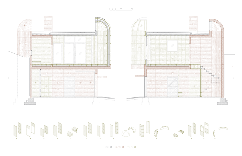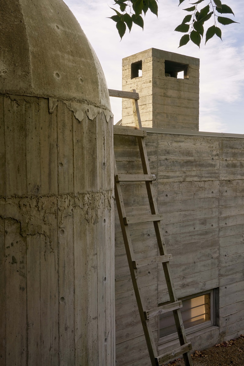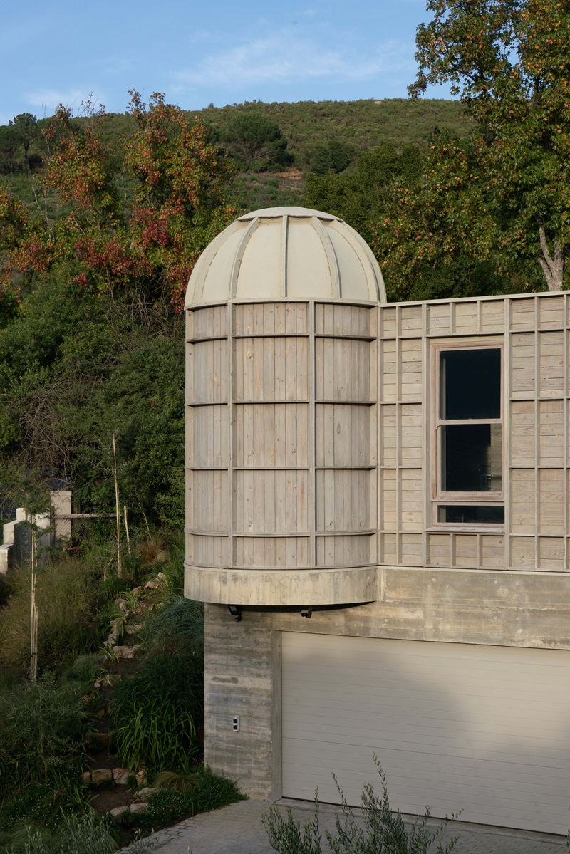 La nueva construcción dispone de 145 m² distribuidos en dos plantas abiertas, con el objetivo de conseguir un espacio de circulaciones fluidas, sencillo de transitar, que diera respuesta a las necesidades de un cliente que desea envejecer viviendo al lado de su familia. Los arquitectos construyen su estética combinando hábilmente el pino y el hormigón. La parte del volumen que está en contacto con la suave pendiente del terreno es de hormigón. En cambio, para las fachadas que están suficientemente elevadas del suelo, el equipo ha usado los paneles de madera, que se emplearon originalmente para dar forma al hormigón. Un juego inverso de materialidades que ha creado rincones en el hogar versionados en ambos materiales. Este es el caso de los dos torreones, uno en hormigón y el otro en madera.