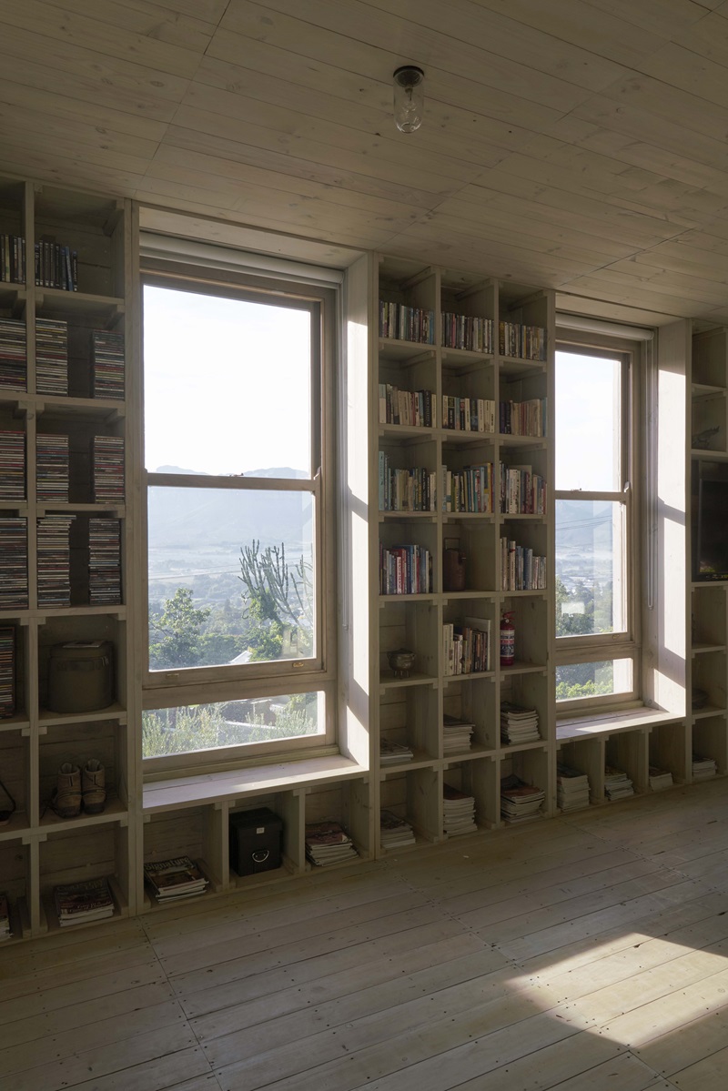 La madera también cobra vida en el interior de este proyecto como mueble, empleándose para construir las estanterías que cubren de suelo a techo las paredes de la zona de estar. Al proporcionar mayor espesor a la envolvente, consiguen aumentar la sensación de aislamiento y generar un espacio más acogedor. En el perímetro de las ventanas, las superficies de madera se pueden utilizar como una pequeña mesa, donde tomar una taza de café. O como un banco, en el que sentarse a leer un libro o desde el que contemplar la naturaleza del paisaje montañoso.