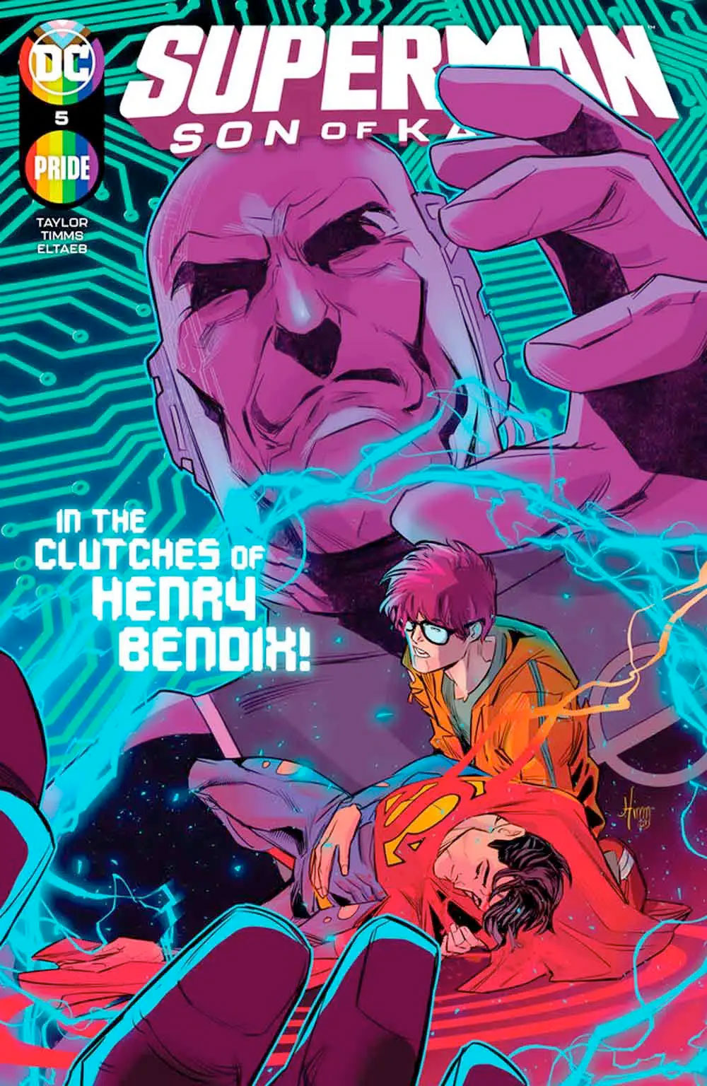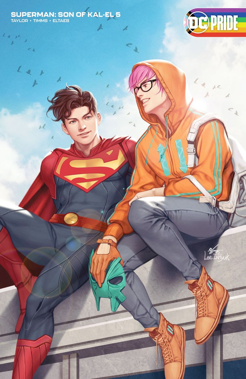 Portada de Superman Son of Kal-El #5 con la bandera LGTBIQ+ bajo las siglas de la editorial DC Comics / Créditos: Dibujos de John Timms, colores por Gabe Eltaeb y tipografía de Dave Sharpe.