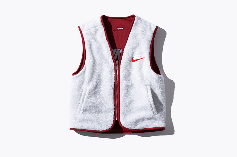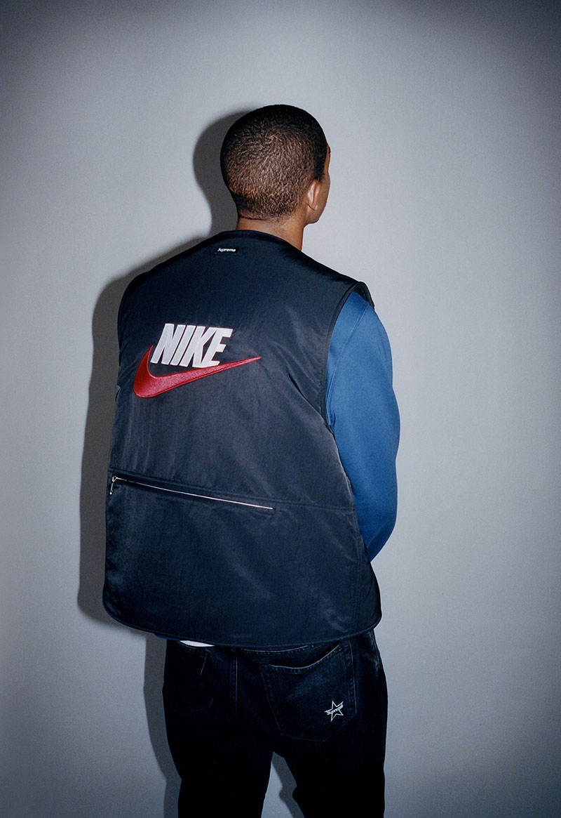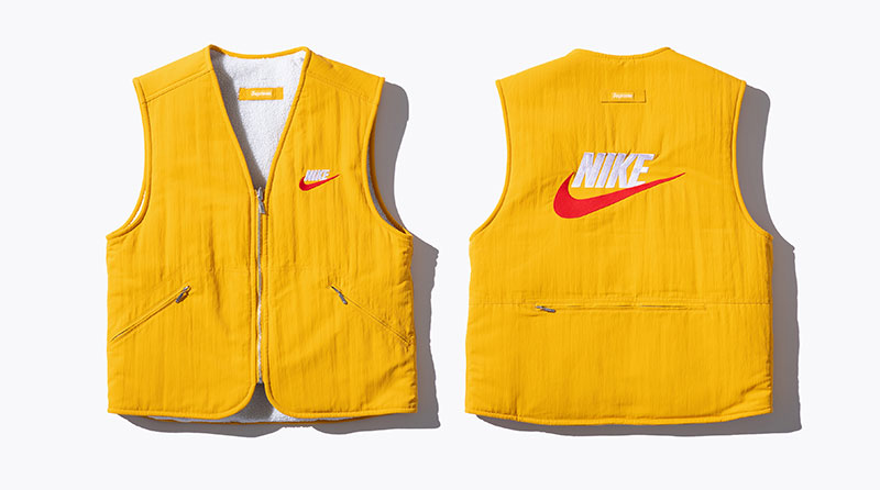 La colección Supreme x Nike se compone de las siguientes piezas hechas exclusivamente para la marca neoyorquina: Cazadora de trabajo y peto en canvas, chalecos reversibles con forro de lana, sudaderas, hoodies, gorros de lanas, pantalones de chandal, bermudas… y la joya de la corona: un pendiente de oro de 14 kilates con el logo de Nike cortado con diamante. Ahí te lo dejó.