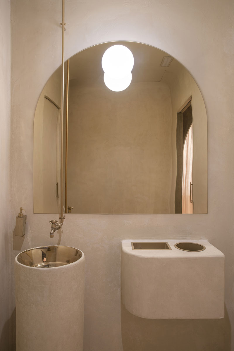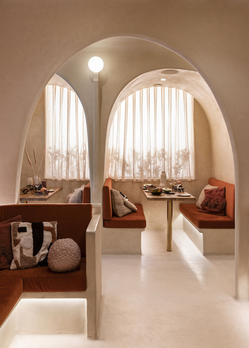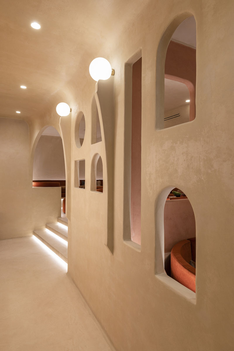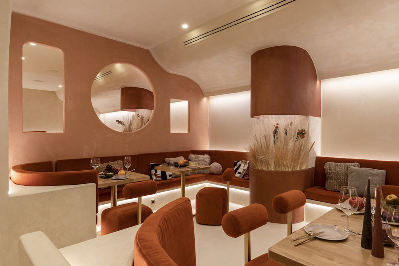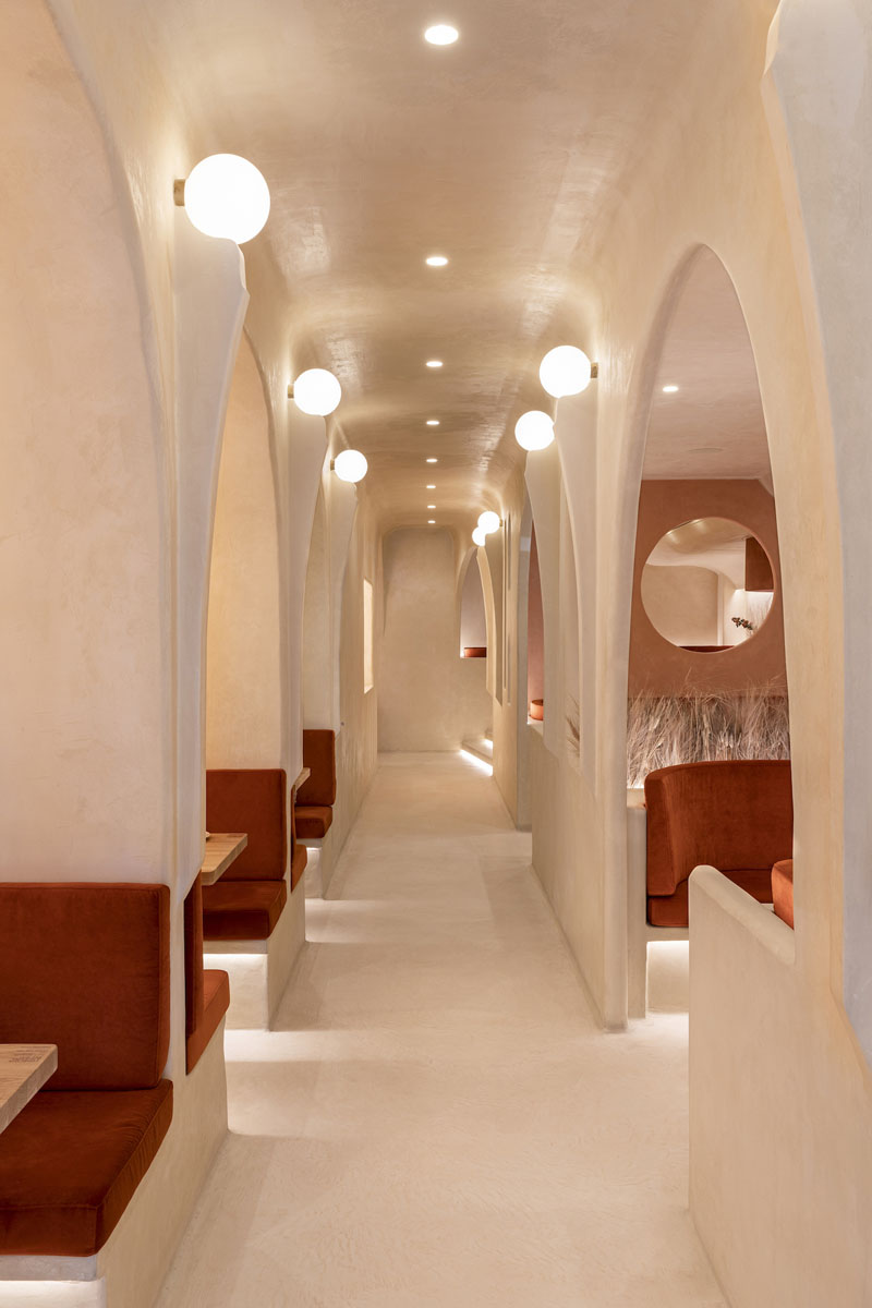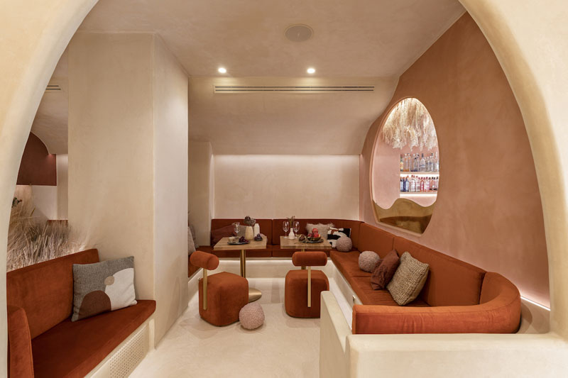 “Hablando un poco más en detalle sobre las formas y materiales de Living Bakkali, en cada momento las formas orgánicas contrastan entre sí, mientras que se crea un efecto de adobe en paredes, pisos y techos, utilizando un material único para todo el diseño, ejecutado completamente a mano como para las casas del pasado que se pretenden representar aquí. Arriba se ha aplicado una paleta de colores más neutra pero ligeramente contrastada que nos recuerda claramente al postre. Por último, pero no menos importante, los efectos de iluminación creados tienen como objetivo resaltar el misterioso y hermoso Oriente por descubrir.” comentan desde Masquespacio