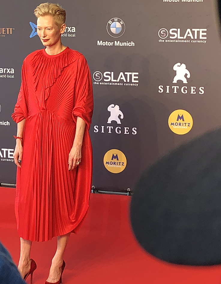 La concentración del photocall se dispersa en un segundo y vamos rápido a tomar posiciones dentro de la sala donde Tilda va a recibir en esta 51 edición del Festival de Sitges, el Gran Premio Honorífico. Suspirábamos por ver una vez más a esa mujer. Apareció desde el fondo del teatro, lo atravesó, fuerte, rápida, y, sonreía, y, sonreía. No recuerdo verla perder la calma, no la recuerdo dejar de sonreír con dulzura mientras se acercaba a dedicarnos unas palabras. Lloró. Y entre lágrimas contó lo mucho que nos agradecía el cariño en un día como ese, en el que esa misma mañana, su padre había fallecido. Suspira profundo. Y nos dio, a todos los que pensábamos en sus ausencias como algo que un ibuprofeno podía resolver, una lección de generosidad y de belleza. Contó que obviamente había dudado de venir a recoger el premio, pero en las últimas semanas junto a su padre, ya durmiendo, ella solía pensar mucho en cuáles serían sus fantasías de ese momento. Recibir ese premio era un homenaje a las fantasías de su padre, después de su último suspiro, y por eso venía.