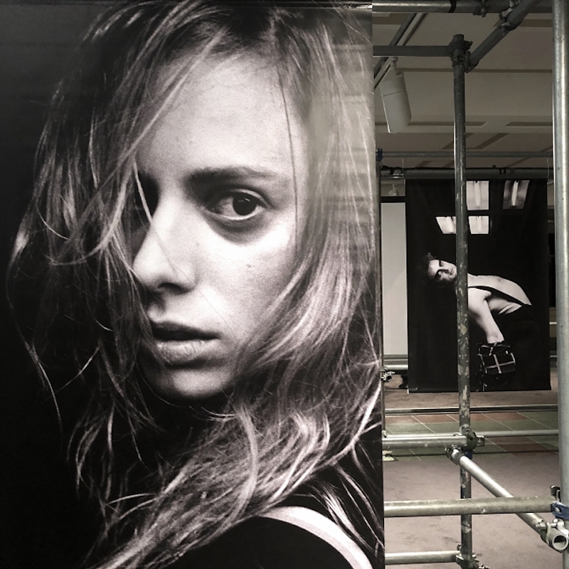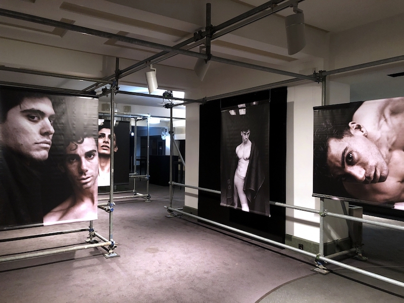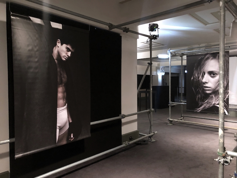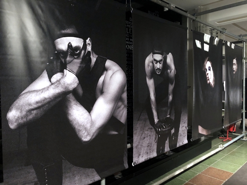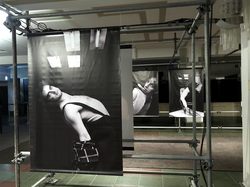 Fotografías de gran formato e impresas en lona —al estilo de las vallas publicitarias— cuelgan de andamios salpicados de pintura, iluminadas con focos que se usan en las obras. Ante la enorme escalinata del vestíbulo hay unas proyecciones de vídeo de un metro de altura.