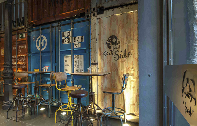 Este cráneo (skull en inglés) es la imagen representativa del local. Las calaveras se suceden en los ventanales y en el interior del restaurante que el madrileño estudio Arinni ha customizado para hacer de este inmueble neoplateresco, antigua residencia de los duques de Sueca y Alcudia, una sede de estética industrial y underground. Entre columnas de fundición, muros de granito y rejería exterior, elementos originales respetados, impactan las paredes de containers y el mobiliario vintage de Francisco Segarra (taburetes altos Kenton Creta, por ejemplo). La pegada es intimidante.
