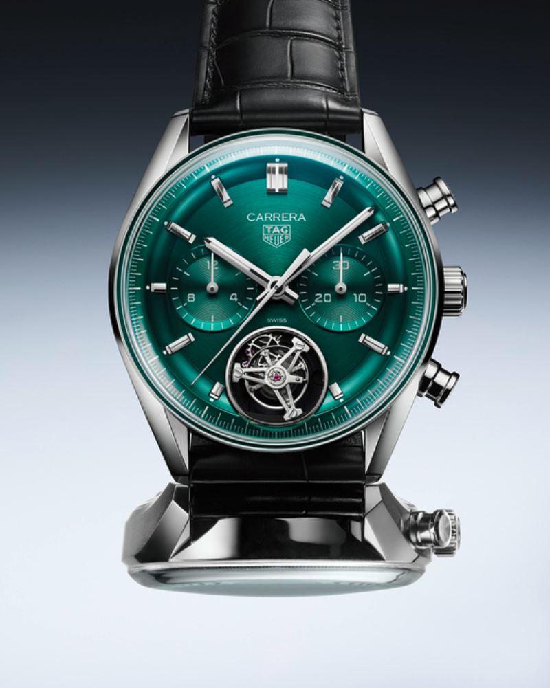 Fiel a la estética de la estrella de esta alineación, la manufactura presenta también una versión más complicada de su Carrera. En cuanto a construcción y materiales, las cosas se mantienen en la misma línea: caja de acero (aunque esta es de 42MM), correa de piel, cristal Glassbox. La verdadera magia está en el interior. Dentro, tenemos un calibre TH20-09 con función de Tourbillon que se deja ver en la sexta posición. Complementando las funciones, tenemos un cronógrafo con contador de minutos y horas en la tercera y novena posición. Y no, el verde de ambos modelos no ha sido dejado al azar: es un homenaje a los colores nacionales de los coches de competición de antaño.