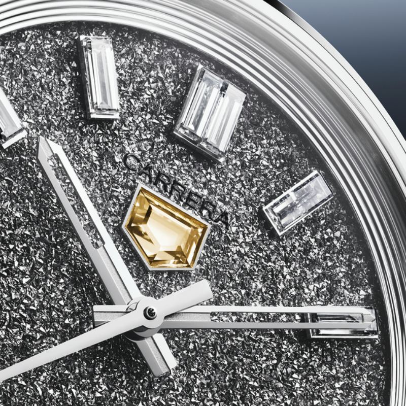 En cuanto a silueta, este nuevo Carrera Chronograph es como todo lo demás, pero hasta allí es donde llegan las similitudes. El nuevo Tag Heuer Carrera Date Plasma Diamant D’avant-Garde es la versión más radical del icono. Y sí, esto es una pieza con diamantes… pero tiene su toque futurista. Tiene 4,8 quilates de puros diamantes… pero son cultivados en laboratorio, reforzando el compromiso de la manufactura por la innovación. En cuanto a construcción, tenemos una caja de oro blanco de 36MM. Los detalles más significativos son el logo triangular de la firma y la corona hechos en diamantes amarillos (sintéticos, claro). Esta pieza se despoja de su función de cronógrafo. En su lugar nos encontramos con un dial policristalino de diamantes cultivados en laboratorio sobre el cual se disponen los indicadores, también engastados. Si queréis algo completamente fuera de lo común, lo habéis encontrado.