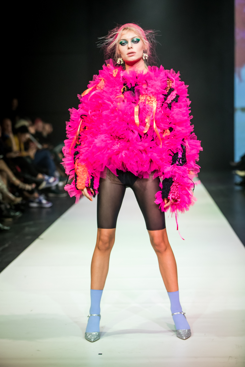 La marca Gita es todo un torbellino en el país. La firma se caracteriza por ser un polvorín de colores, donde la simetría no existe y por encima de todo la mujer es la protagonista. Su nueva propuesta es arriesgada tanto en la combinación de contraste de colores y en la técnica artesanal. El rosa y el naranja neón se fusionan con un maquillaje salvaje y urbano.