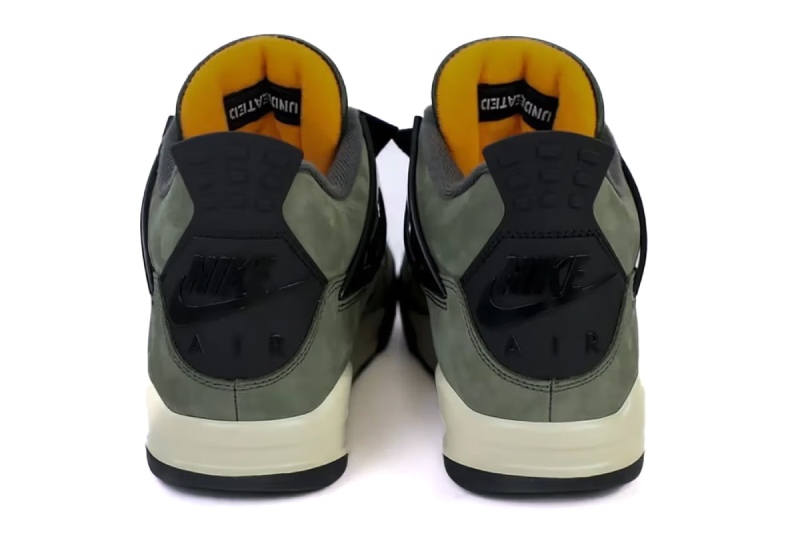 En cuanto a su construcción, las nuevas Undefeated X Air Jordan 4 presentan un upper de nubuck verde oliva de inspiración militar. La malla lateral y su rejilla también siguen este color; pero las jaulas laterales, el empeine y la talonera vienen en negro como las originales. También tendremos parches de velcro en las lengüetas con Jumping Mans en naranja o tipografía militar si se los quitamos; y el forro interior de este segmento también se remata de este color más llamativo.