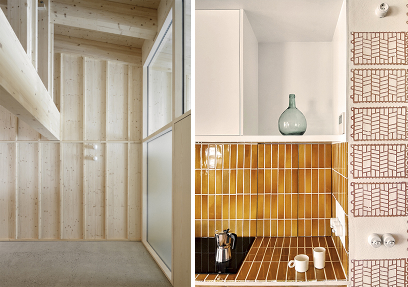 Imagen superior izquierda: Vista interior de la escuela en Orsonnens. Fotografía de Luis Díaz Díaz. Imagen superior derecha: Detalle de la cocina de Can Picafort, donde la baldosa a veces vidriada protege las zonas húmedas. Fotografía de Luis Díaz Díaz. TEd’A arquitectes