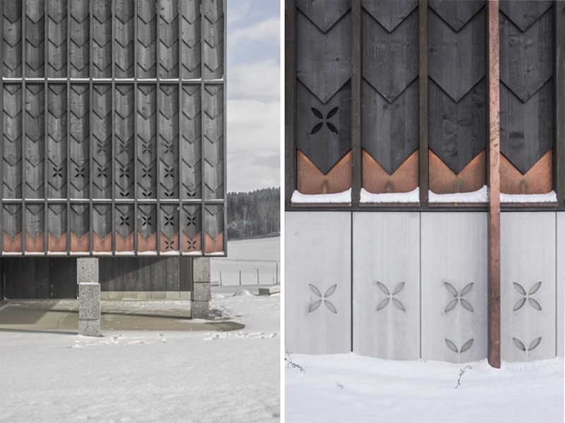 Imagen superior izquierda: Detalle de la zona de acceso a la escuela en Orsonnens. Fotografía de Luis Díaz Díaz. Imagen superior derecha: Detalle de la fachada de la escuela en Orsonnens. Fotografía de Luis Díaz Díaz. TEd’A arquitectes
