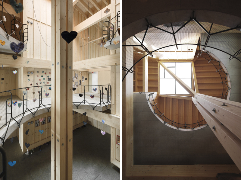Imagen superior izquierda: Vista interior desde la primera planta alrededor del pilar central de la escuela en Orsonnens. Fotografía de Luis Díaz Díaz. Imagen superior derecha: Vista contrapicada del patio de la escuela. Fotografía de Luis Díaz Díaz. TEd’A arquitectes