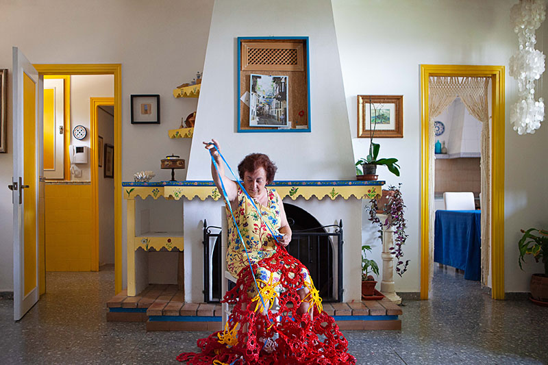 Pese a las reticencias iniciales, actualmente son más de 30 personas las que participan de manera activa en el proyecto. Se tejen piezas a mano, mediante la técnica del ganchillo, utilizando plástico reciclado. Con esta acción crean cientos de metros lineales de tela a modo de parasoles, que sirven para vestir los cielos del pueblo de colores y dar sombra durante los meses estivales.