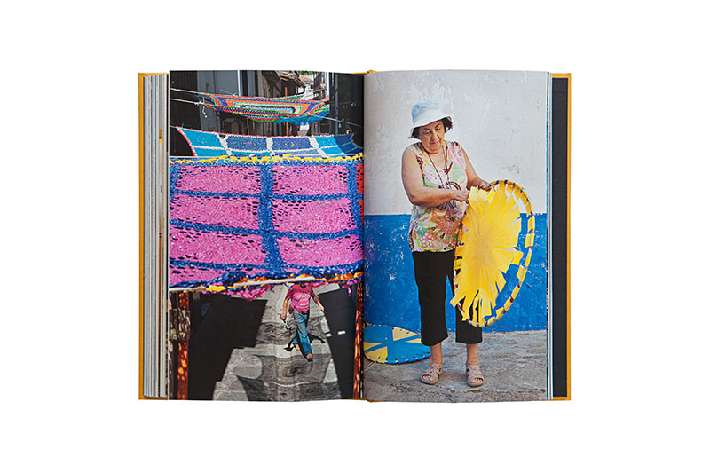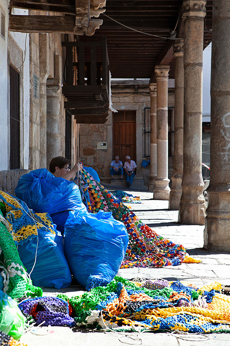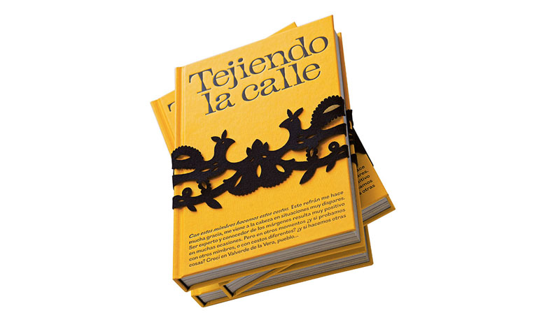 La arquitecta Marina Fernández Ramos es la artífice de este proyecto que lleva por título Tejiendo la Calle. Se trata de una acción efímera que empodera a la mujer y reivindica las tradiciones rurales del pueblo extremeño. Además, se visibiliza una España vaciada en un acto de sinceridad afectiva y festiva que recibe a familiares y amigos durante el periodo estival. Esta iniciativa craftivista -ya que aúna reivindicación con lo hecho a mano- ha suscitado el interés y la implicación de vecinos y extraños: tras casi 10 años de ganchillos y croché, el proyecto ha dado el salto al papel gracias a Rua Ediciones.
