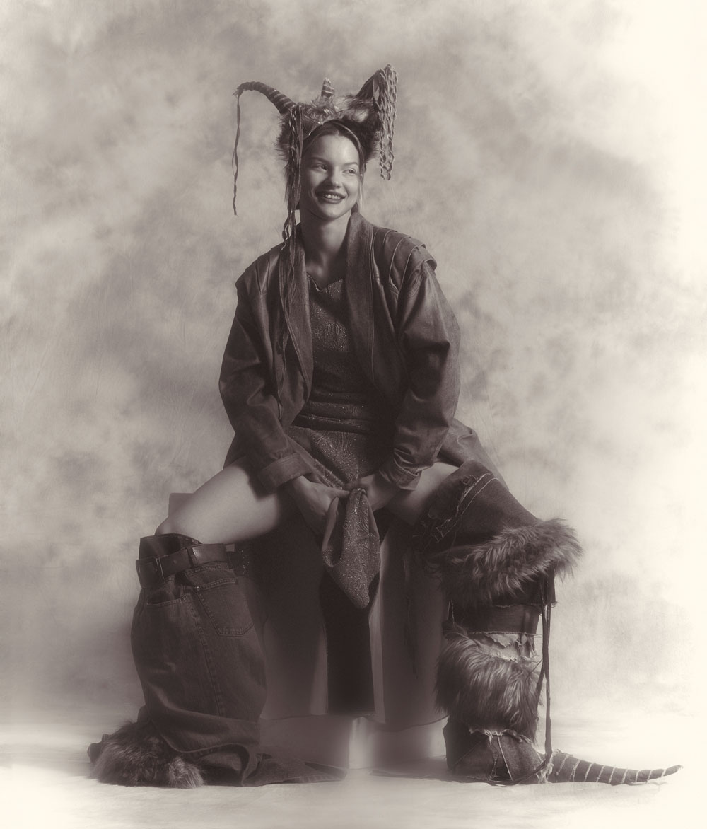 Arriba y abajo: Casco con cuernos ANTONINA UGLOVA + Abrigo de piel Vintage + Botas KARINA KRAPIVA