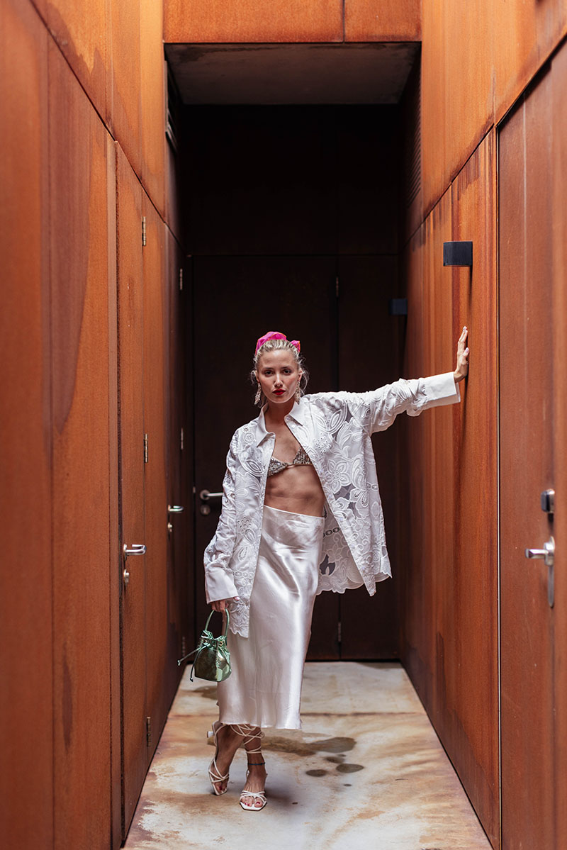La colección se compone por trajes relajados, vestidos drapeados, piezas de ganchillo y accesorios bastante interesantes propuestos en una paleta de colores ideal para la temporada; el blanco y el amarillo son algunos de los protagonistas. Y si sois más del rollo street, también hay un componente presentado en colores más oscuros ideal para esas noches de rave.
