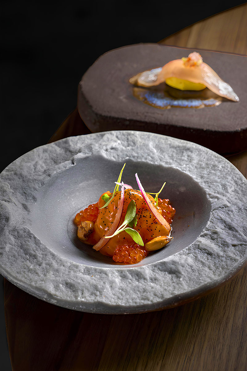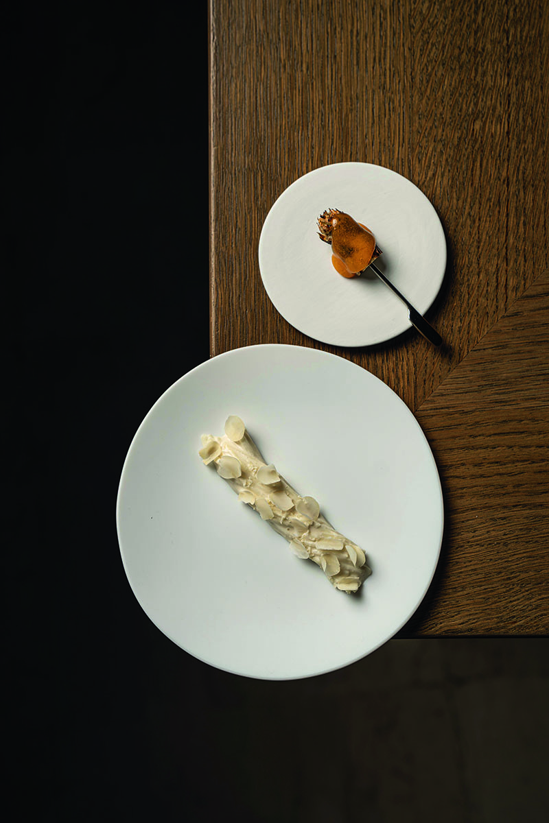Tronco: Hilos, leche de almendras y raifort. Yema-Yema: Brasa con gel de yema de huevo y garum a la Ratafía. Platos del restaurante Aürt. Fotografía de Mikel Ponce