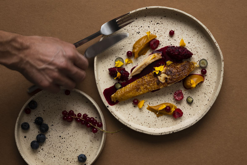 Suprema de ave rustida acompañada de un confit de bayas y jugo de remolacha. Plato de Trèsde. Foto: Laura Alandes