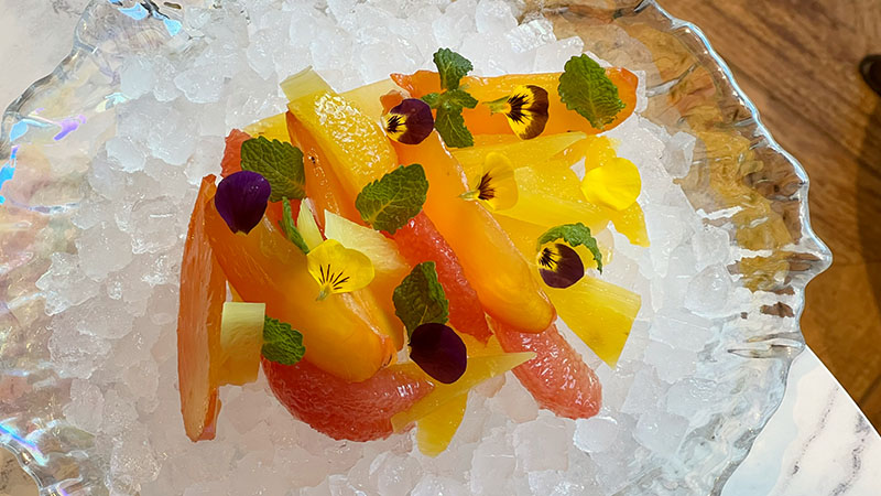 Se compone de 6 pases. Por un lado, comenzamos con una elaboración a partir de hummus de judías blancas del Ganxet y acompañado de verduras asadas a la llama y rocas de carbón ahumadas. Continuamos con unas alcachofas confitadas con notas cítricas de naranja sanguina, un bombón líquido de aceitunas verdes y naranja confitada con delicadas pinceladas de azafrán. Por otro lado, tenemos un cuscús con hortalizas verdes, calçots a la parrilla, infusionados en su jugo de cebollas asadas y esencia vegetal realzada con la exquisitez de la trufa negra. Además, sobresalen el arroz cremoso, acompañado de setas de temporada, espárragos verdes y trufa fresca de invierno y la tartaleta de berenjena y boletus Edulis. Finalmente, terminamos con el postre Naranja y Caqui.