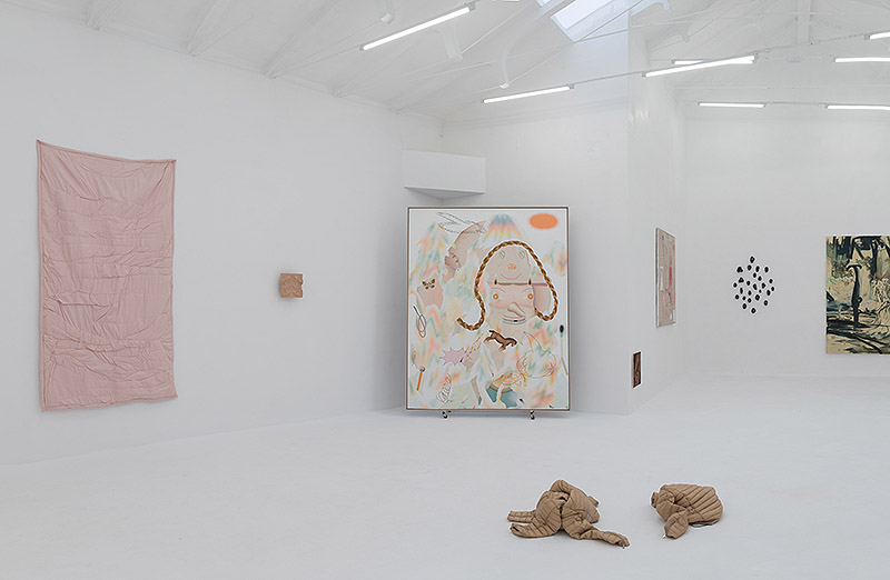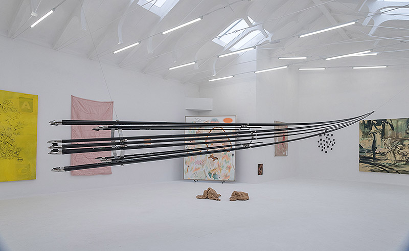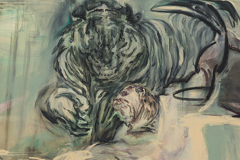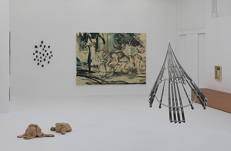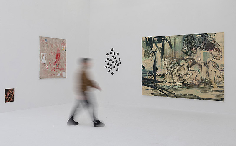 “Lo informe y el desbordamiento de las formas lo encontramos también en la obra The Viewer, donde Irving Ramó trabaja el enfrentamiento como un gesto reiterativo que vincula batallas heroicas del pasado con la transformación del cuerpo en el presente.” Explica García Marqués. En esa misma línea, las pinturas de Marcus Nelson y Jan Vallverdú exploran la tensión entre lo primitivo y lo fugitivo. Añade García Marques, “Mientras que en Nelson la imagen lucha por contenerse dentro del lienzo, en Vallverdú se derrama y se diluye, abrazando la inestabilidad de la forma”.